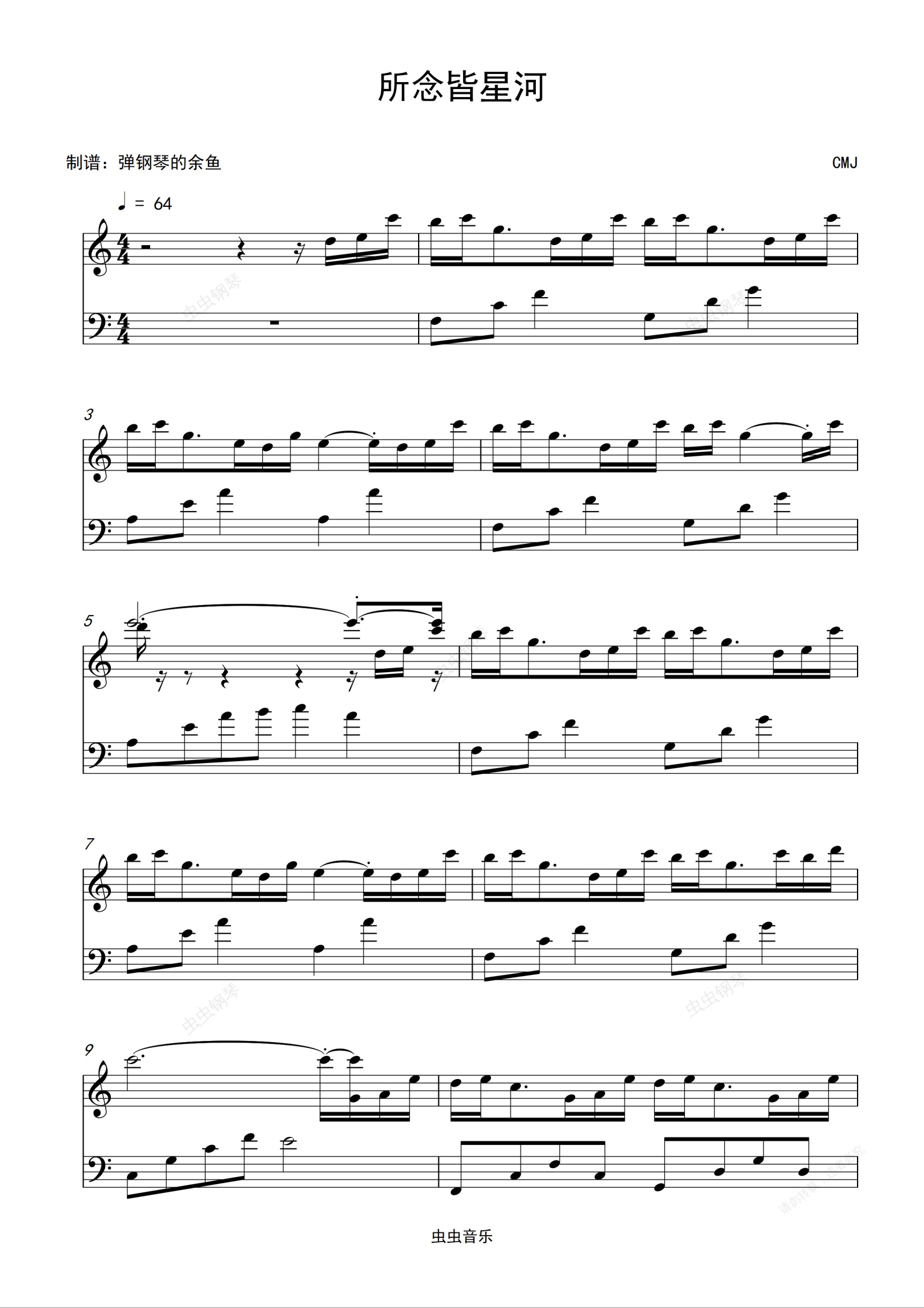 钢琴谱:所念皆星河-C调-超还原完整版-新手好听易学-弹钢琴的余鱼编配-治愈系热歌