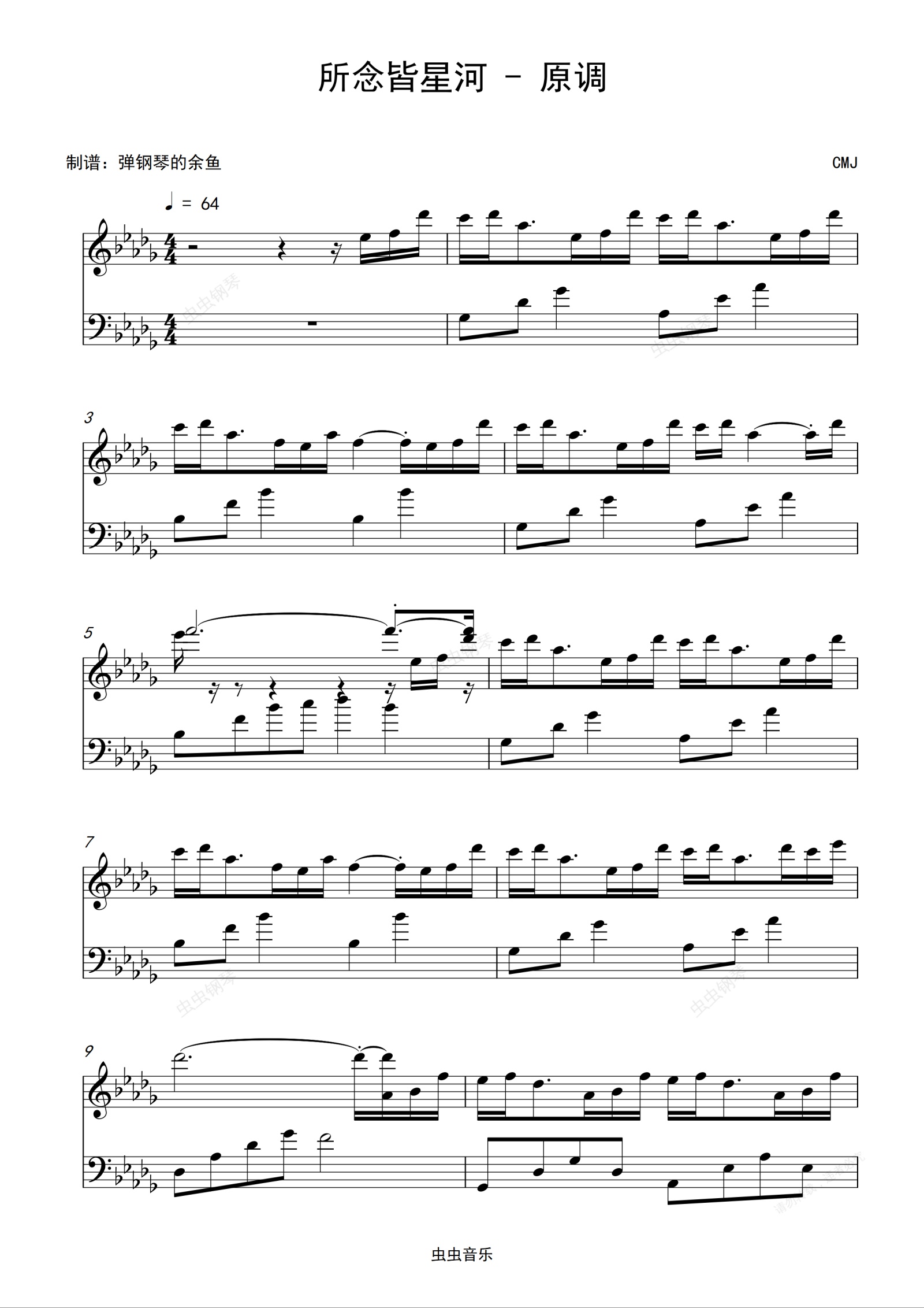 钢琴谱:所念皆星河-完整版-原调bD超还原-新手好听易学-弹钢琴的余鱼编配