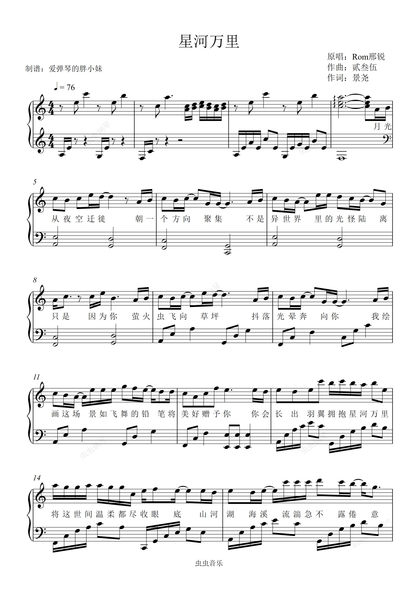 钢琴谱:《星河万里》C调初学者简单版(配歌词)