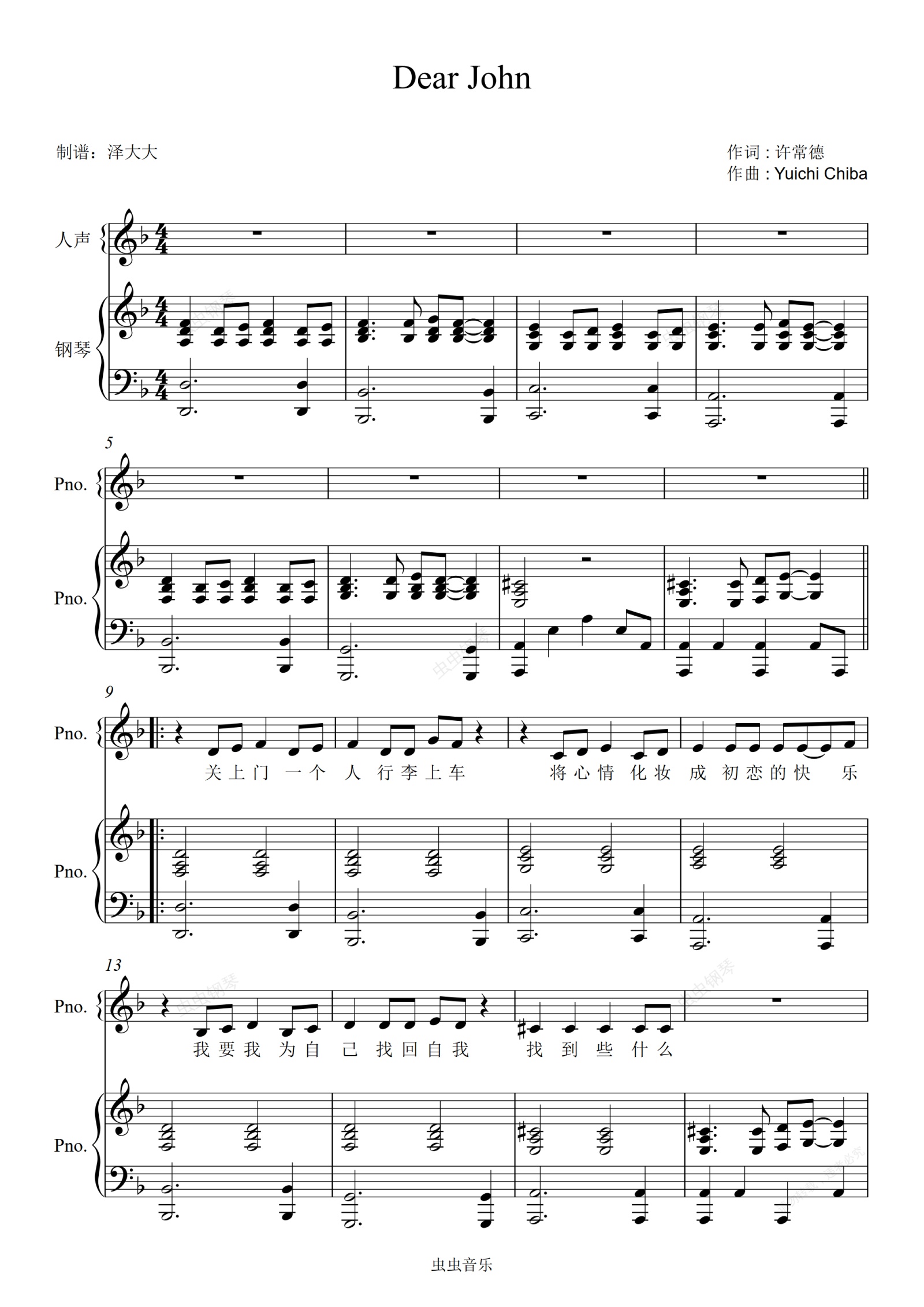 钢琴谱:Dear John【原版弹唱附词】泽大大 比莉