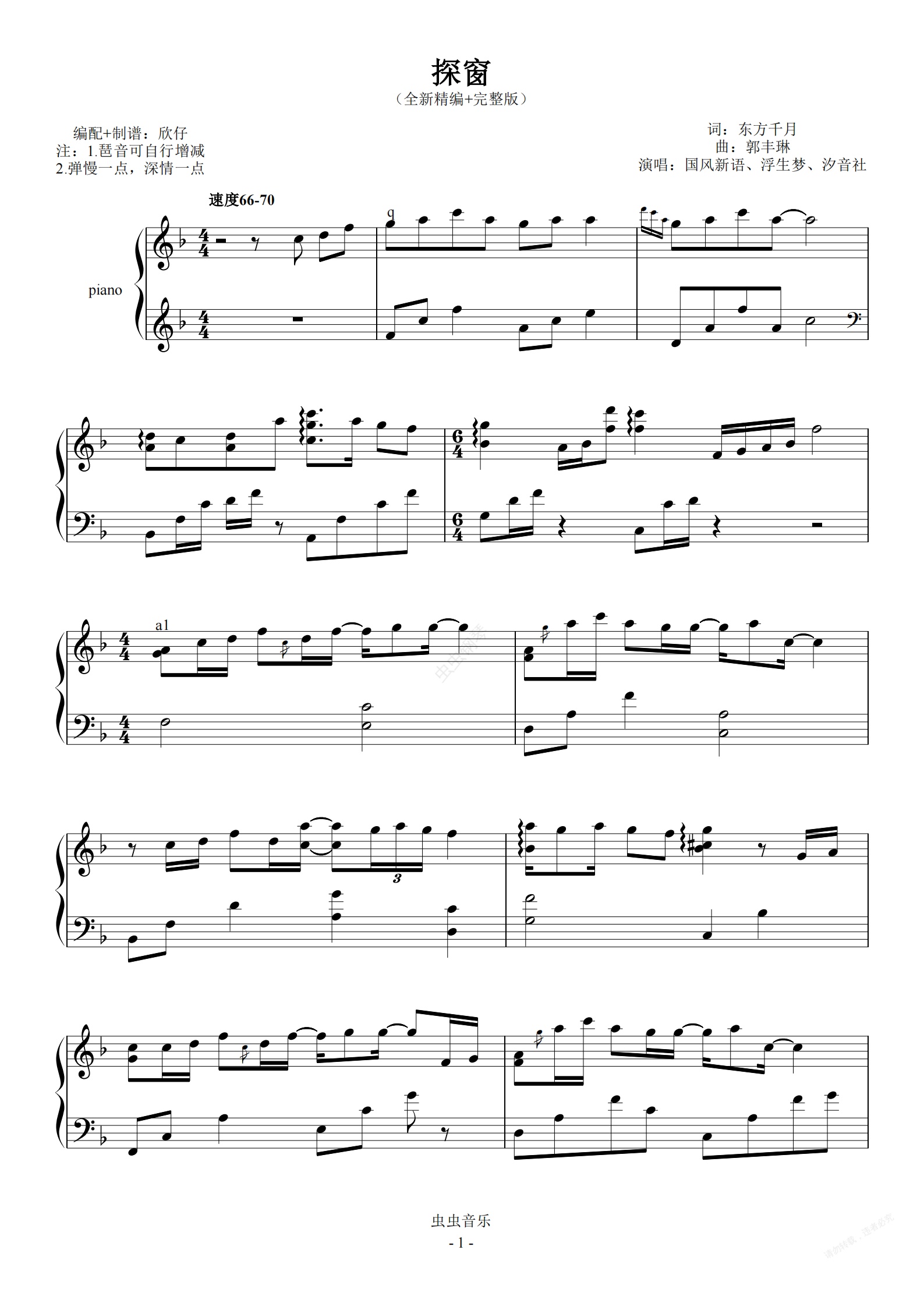 钢琴谱:浮生梦-古风-F《探窗》(全新精编+完整版)