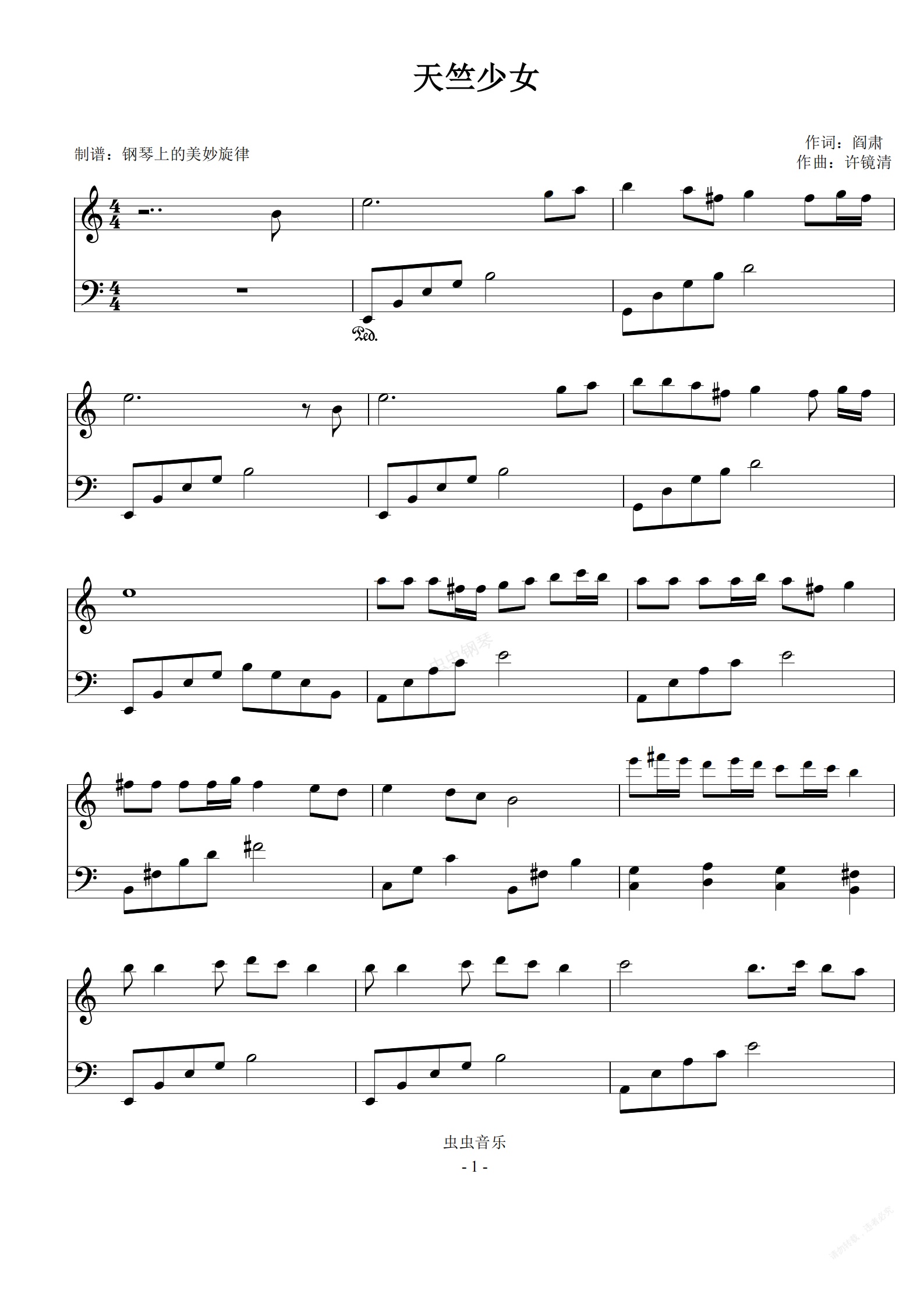 钢琴谱:天竺少女 C调简易版 西游记经典插曲