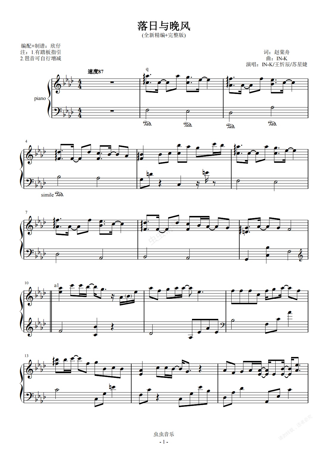 钢琴谱:IN-K/王忻辰/苏星婕-降A《落日与晚风》(全新精编+完整版)