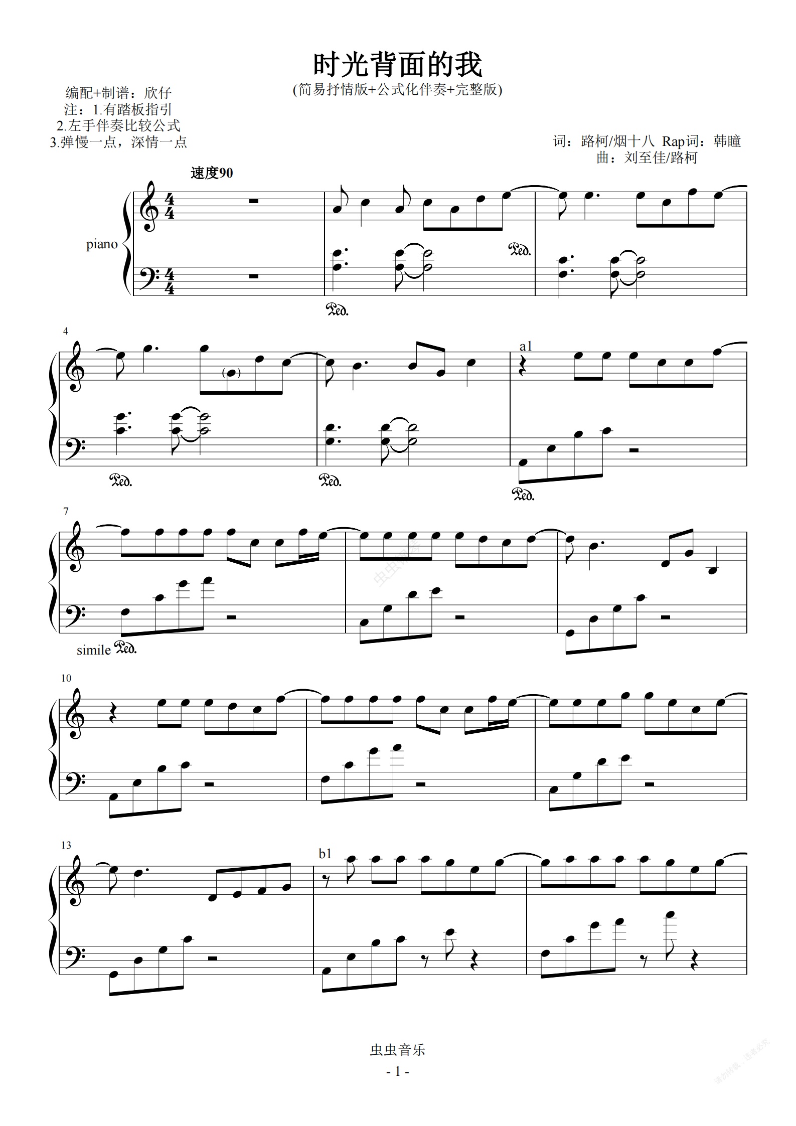 钢琴谱:刘至佳、韩瞳-C《时光背面的我》(简易抒情+公式化伴奏+完整版)