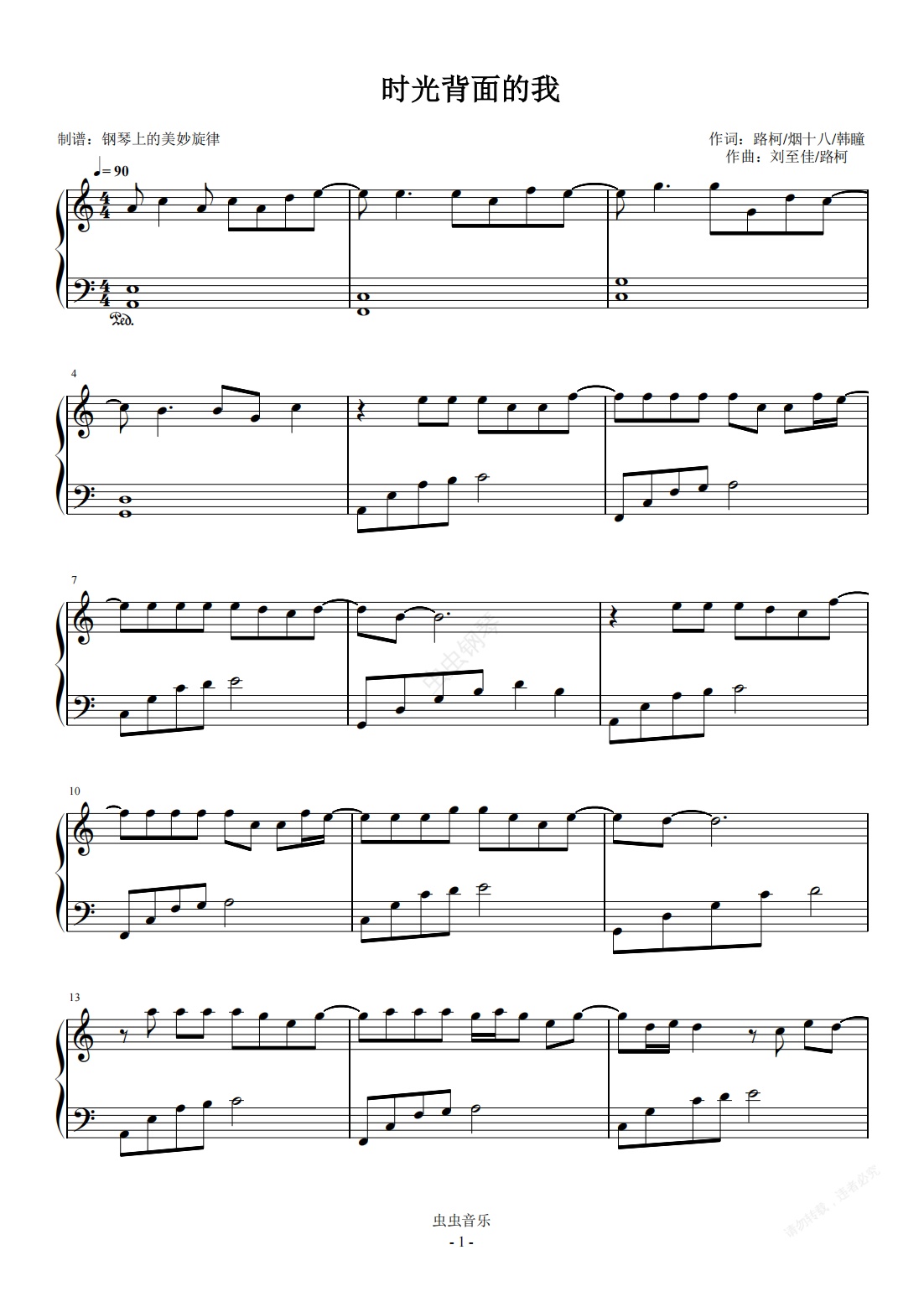 钢琴谱:时光背面的我 C调简易版 刘至佳 / 韩瞳