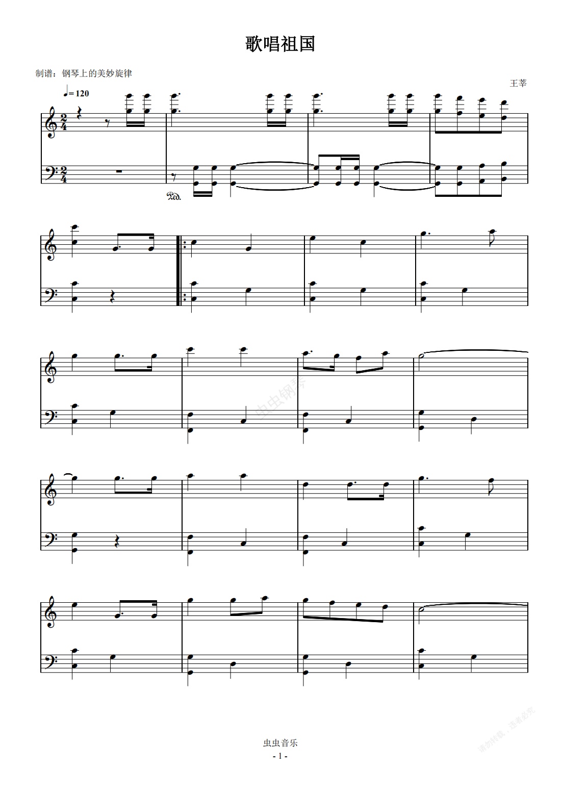 钢琴谱:歌唱祖国 C调简易版  初学版  经典红歌