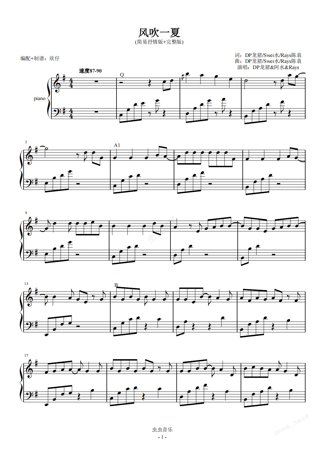 钢琴谱:简易抒情版-G《风吹一夏》(完整版)
