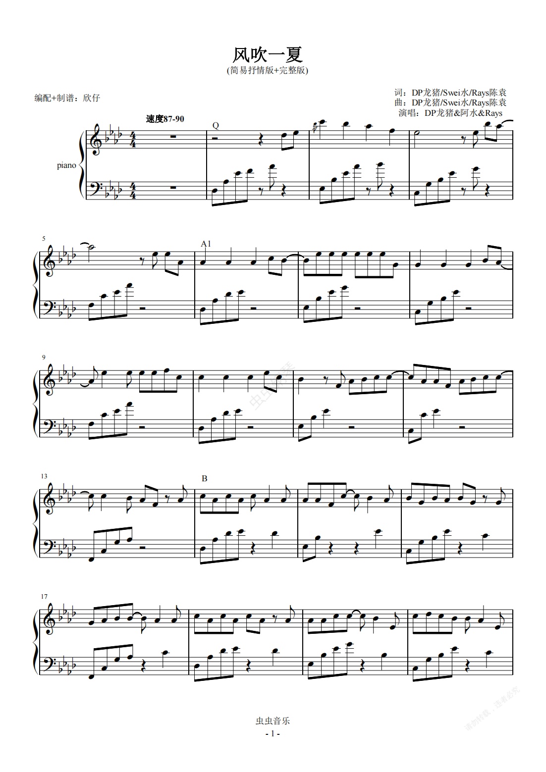 钢琴谱:简易抒情版-降A《风吹一夏》(完整版)