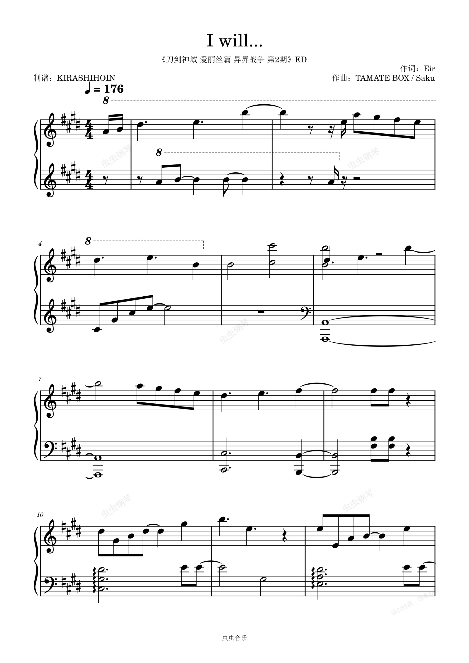 钢琴谱:I will...(《刀剑神域 爱丽丝篇 异界战争 第2期》ED) - 蓝井艾露