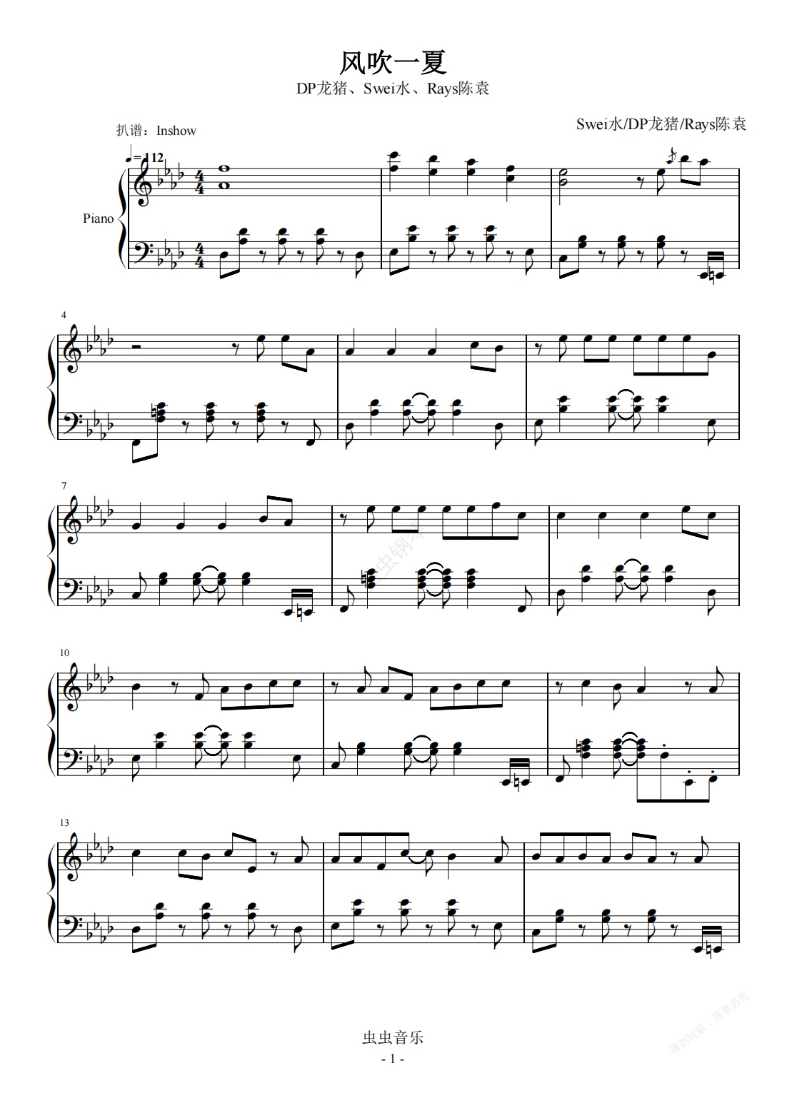 钢琴谱:风吹一夏【完整独奏】- DP龙猪、Swei水、Rays陈袁 -