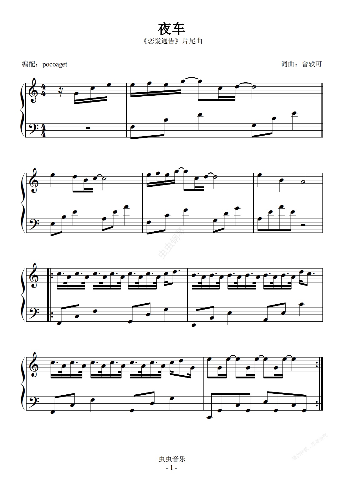 钢琴谱:夜车《恋爱通告》片尾曲(poc)编配