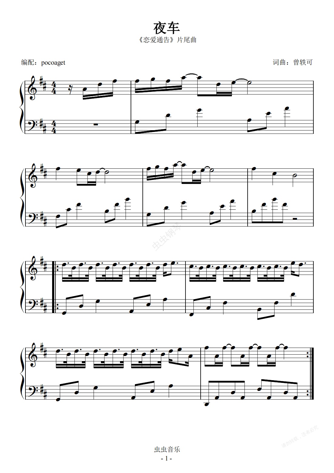 钢琴谱:夜车《恋爱通告》片尾曲(Poc编配)
