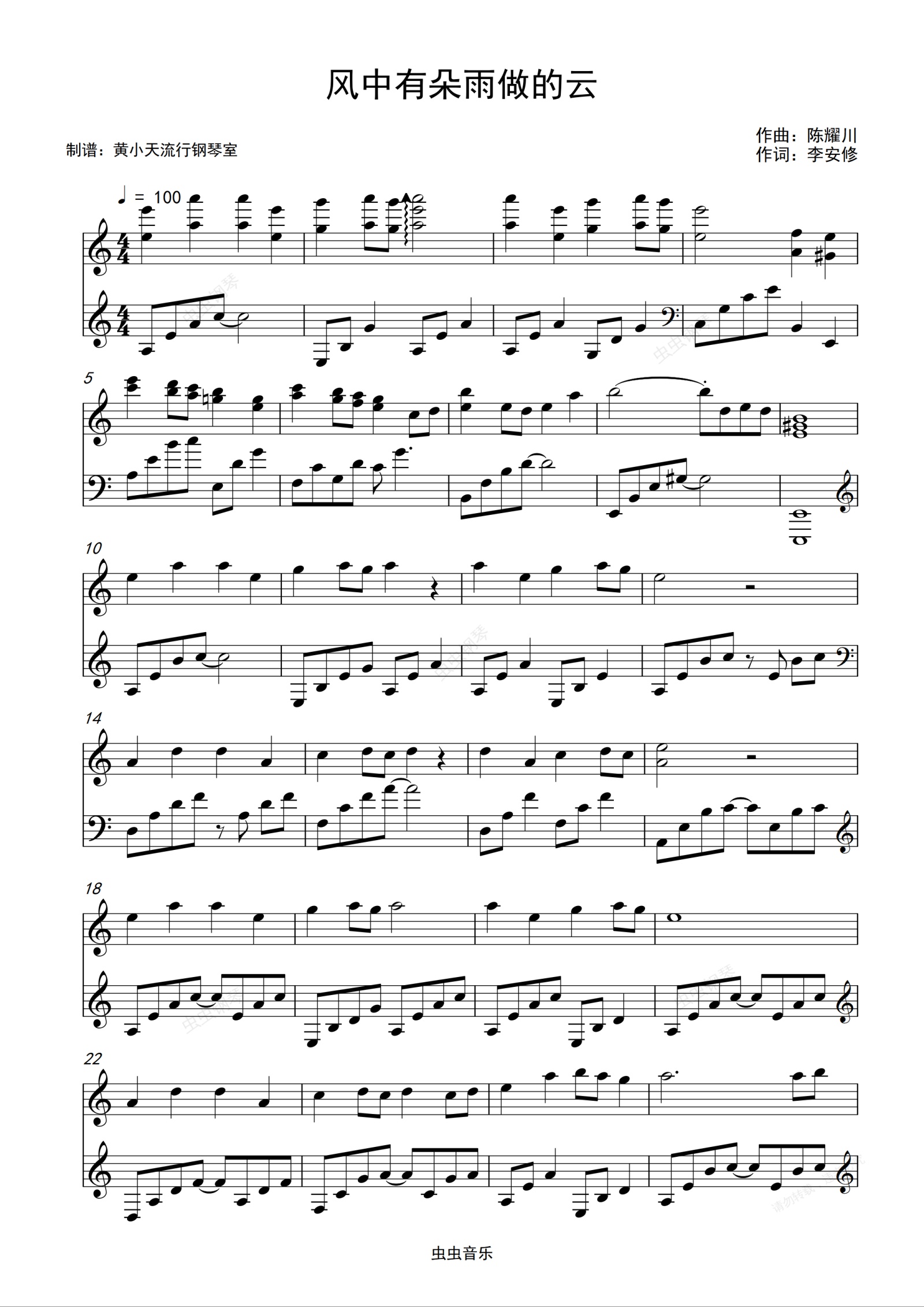 钢琴谱:风中有朵雨做的云 C大调简易版