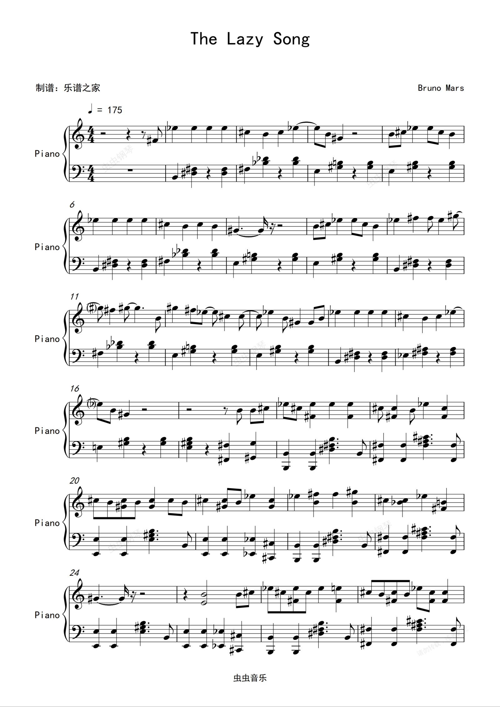 钢琴谱:Bruno Mars “The Lazy Song”懒人之歌 独奏钢琴谱 高清谱