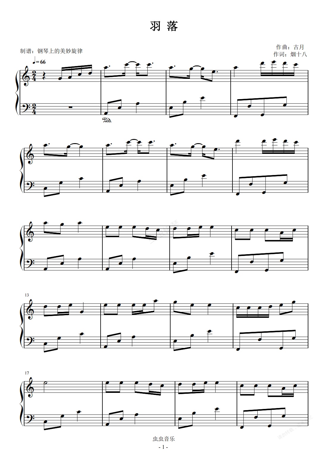 钢琴谱:羽落 C调简易版