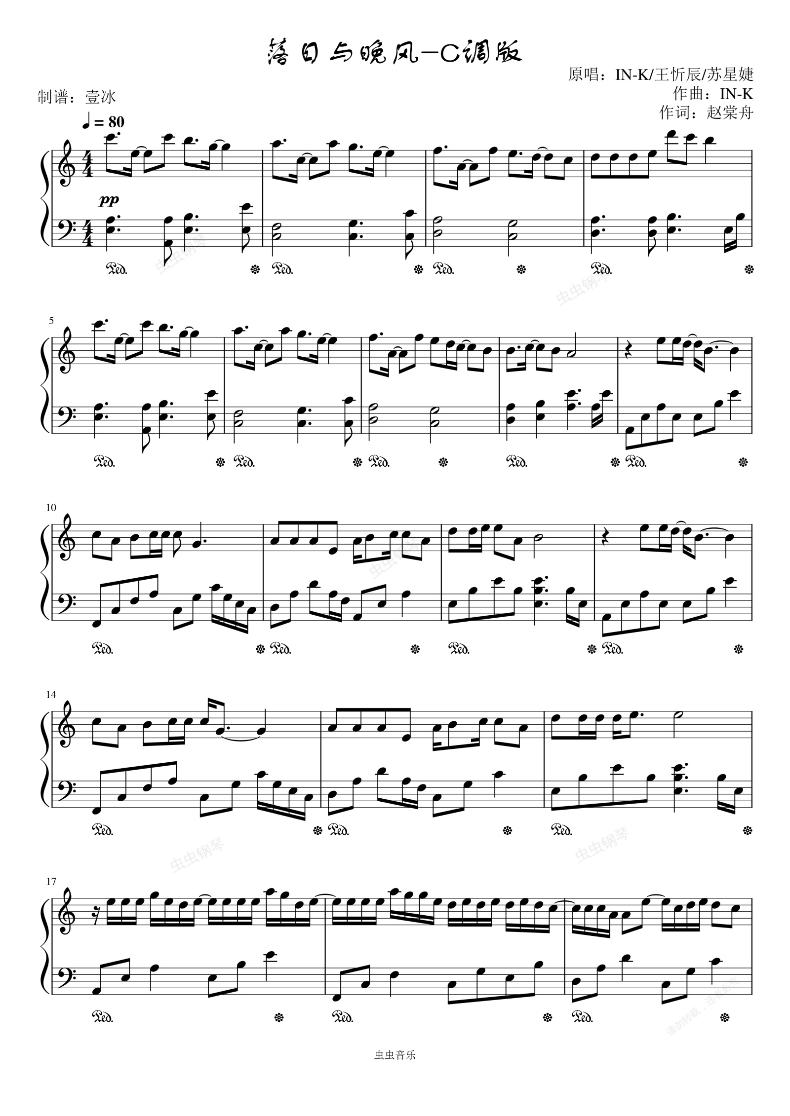 钢琴谱:落日与晚风//IN-K/王忻辰/苏星婕-C调版