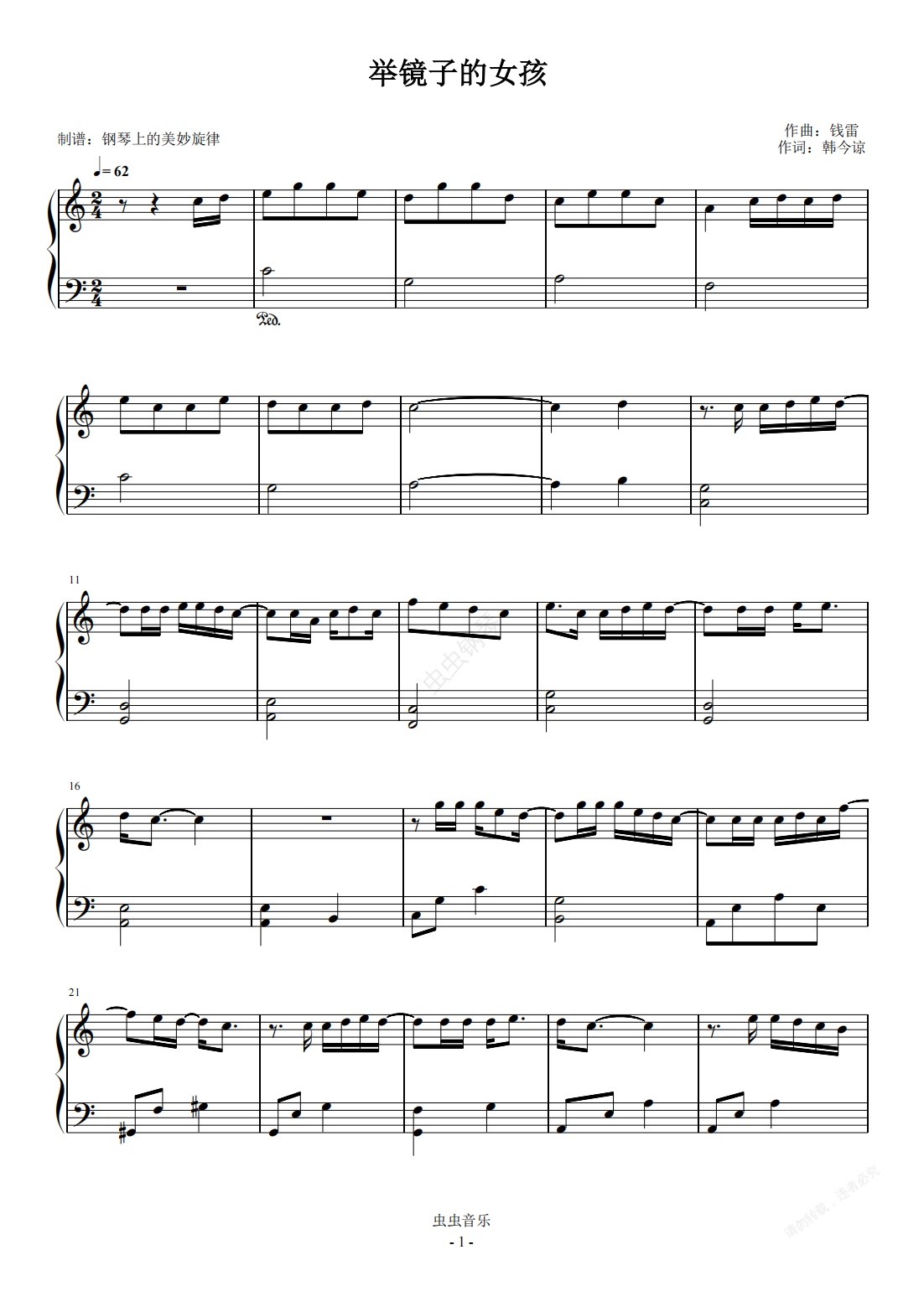 钢琴谱:举镜子的女孩 C调简易版 张子枫