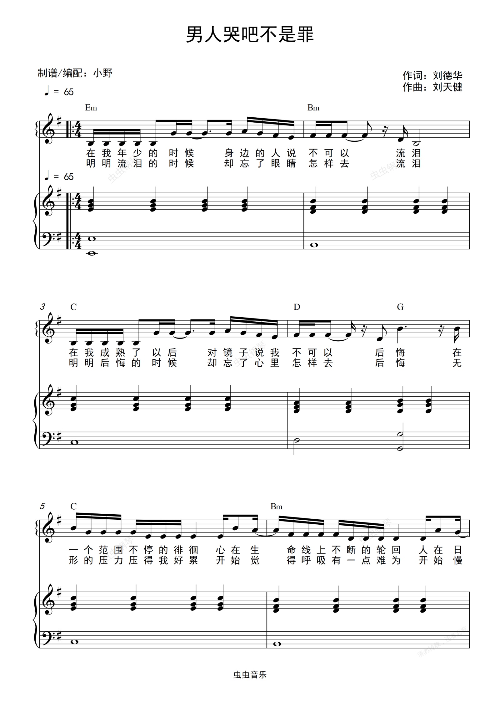 钢琴谱:男人哭吧不是罪(和弦弹唱版)