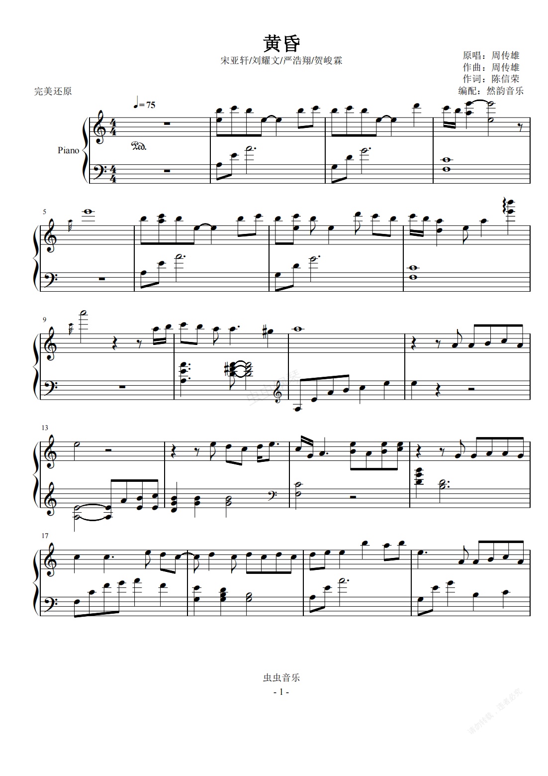 钢琴谱:【C调】黄昏-宋亚轩/刘耀文/严浩翔/贺峻霖 钢琴完美还原 TNT时代少年团粉丝见面会【然韵音乐编配】