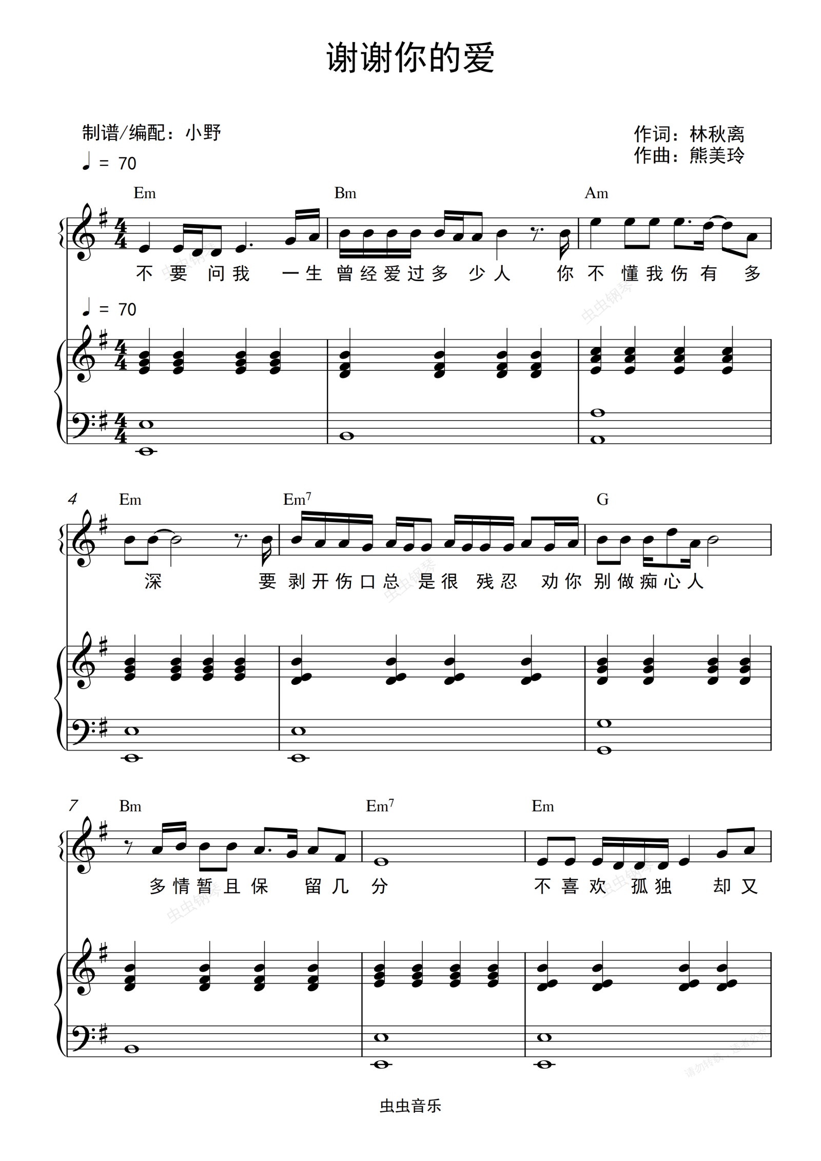 钢琴谱:谢谢你的爱(和弦弹唱版)