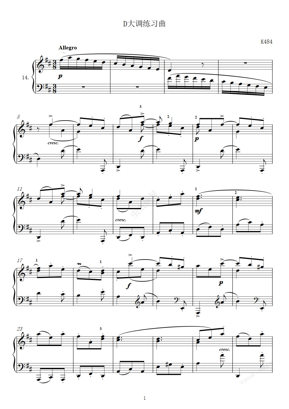 钢琴谱:第14首D大调练习曲