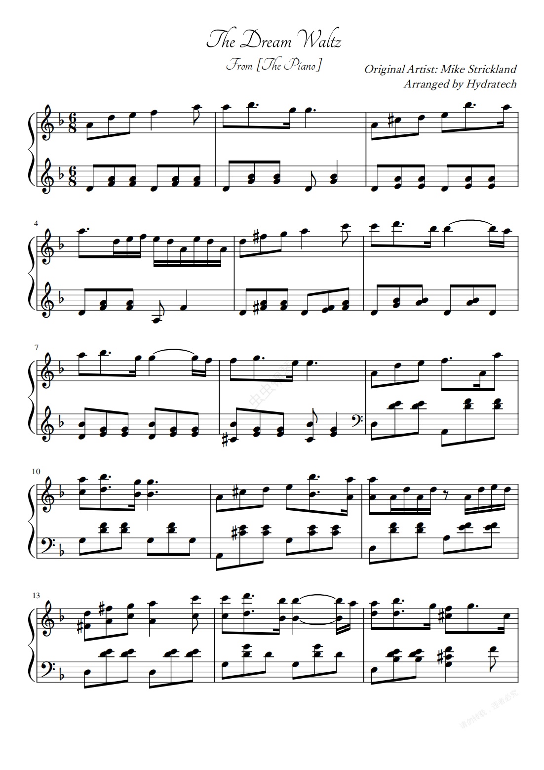 选自Mike的专辑《The Piano》。无论我多少次听和演奏这首曲子,它带来的兴奋感和旋律的侵彻性是丝毫不减的。全曲左手伴奏整体上维持ABB式和弦分解,中间却不断穿插八分音符切分音、琶音和弦分解和32分休止拍进行增色,保持旋律猎奇,完美描绘出华尔兹舞步形象中顿步、小碎步的节奏,画面感跃然曲上。较快的速度进行凸显了“梦境的易逝”,但是灵活掌握渐慢和突慢节奏又能为抒情创造机会。(相比原曲有细节改动)(本人非音专,编配及制谱如有谬误请多指教)