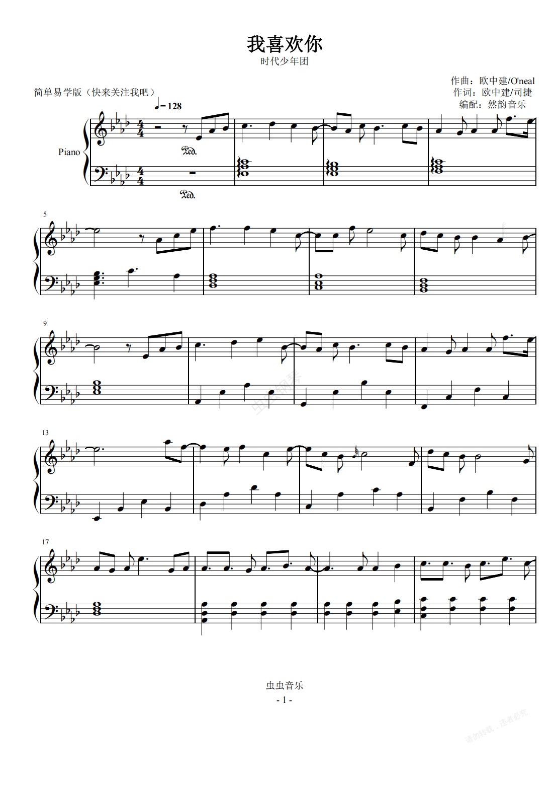 钢琴谱:【免费】我喜欢你-TNT时代少年团 简单易学版【然韵音乐编配】