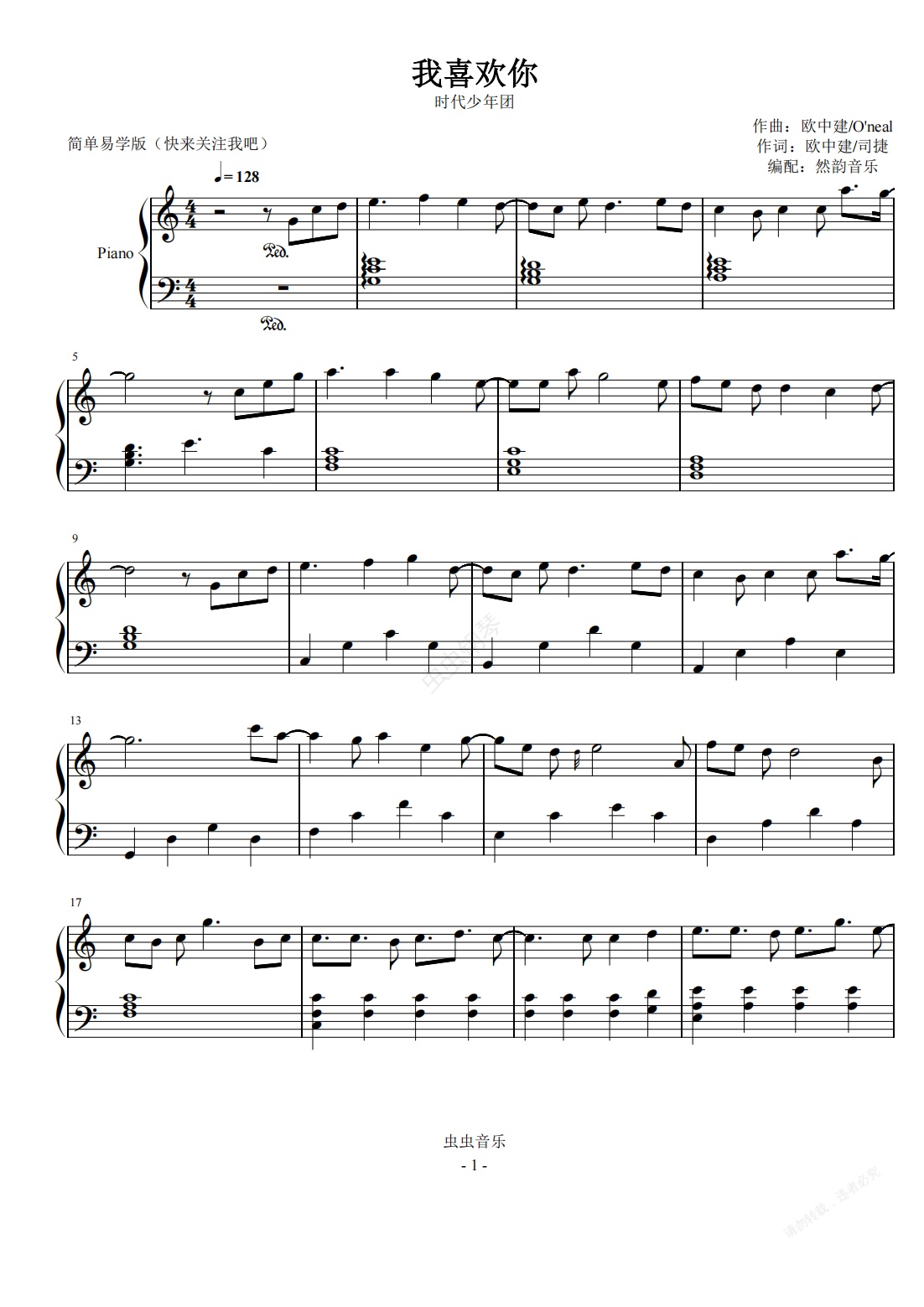 钢琴谱:【C调】我喜欢你-TNT时代少年团 简单易学版【然韵音乐编配】