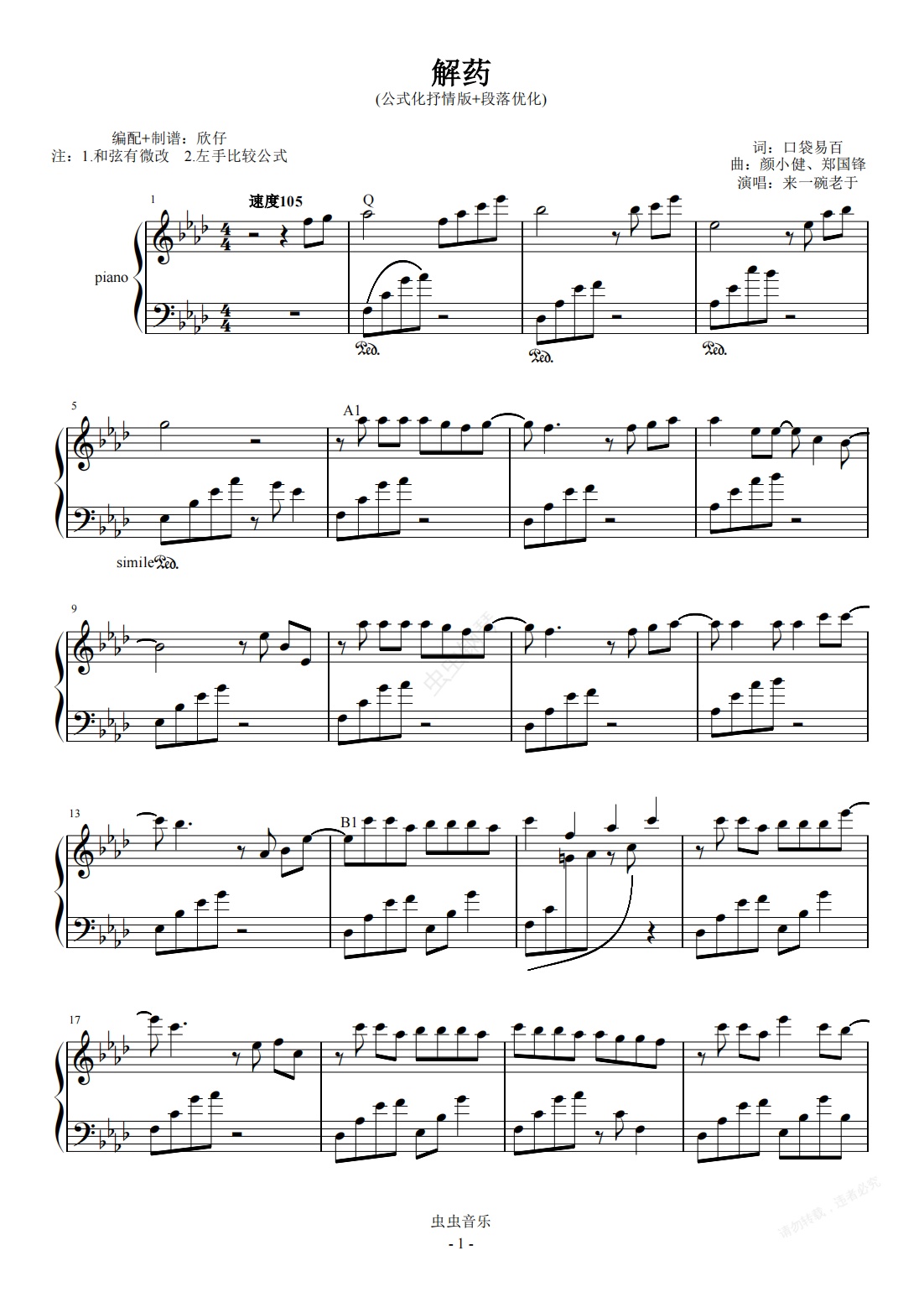 钢琴谱:来一碗老于-降A《解药》(抒情简易版+段落优化)