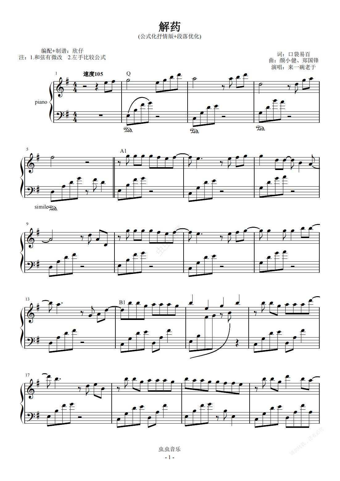 钢琴谱:来一碗老于-G《解药》(简易抒情版+段落优化)