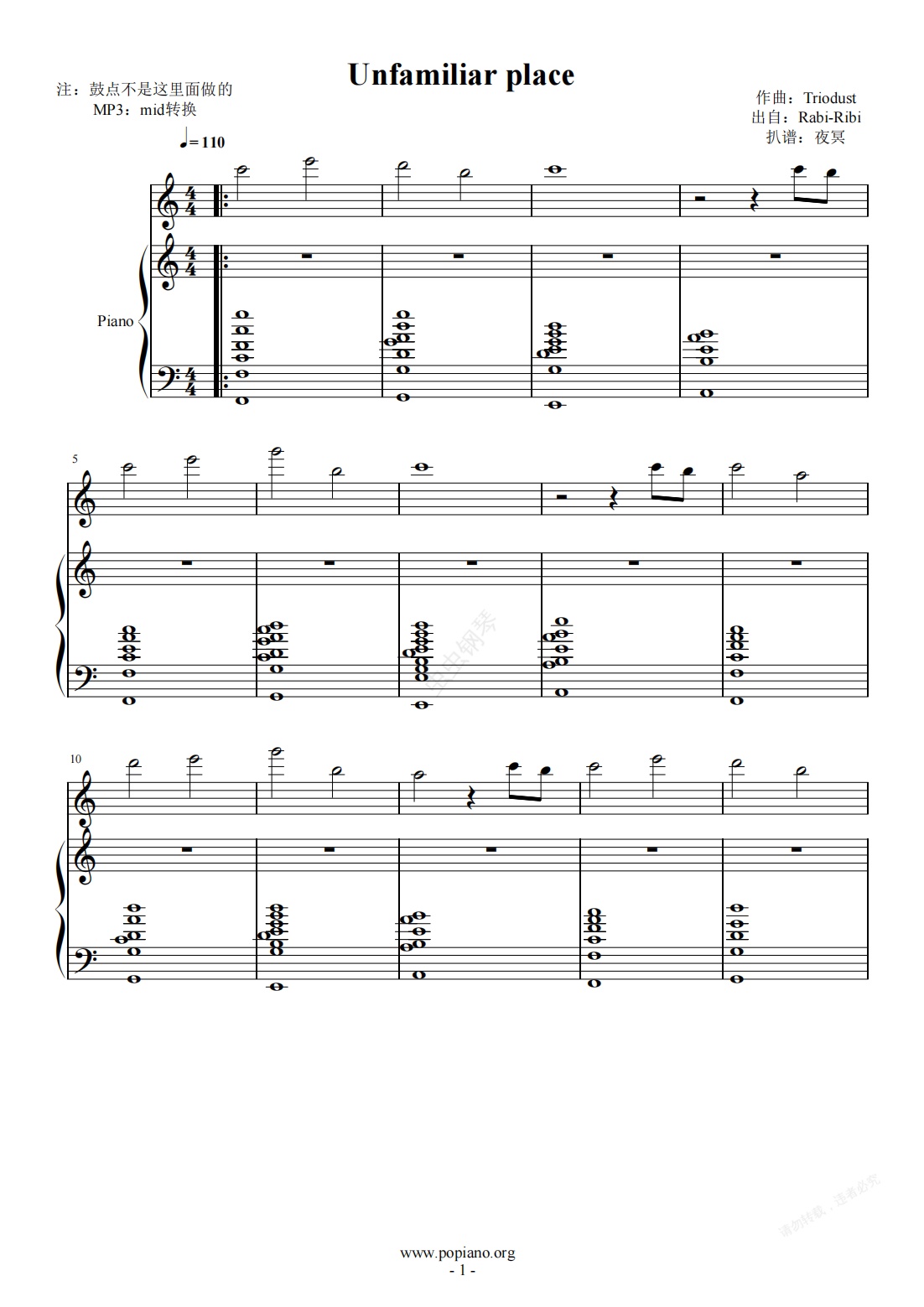 钢琴谱:Rabi-Ribi - Unfamiliar Place