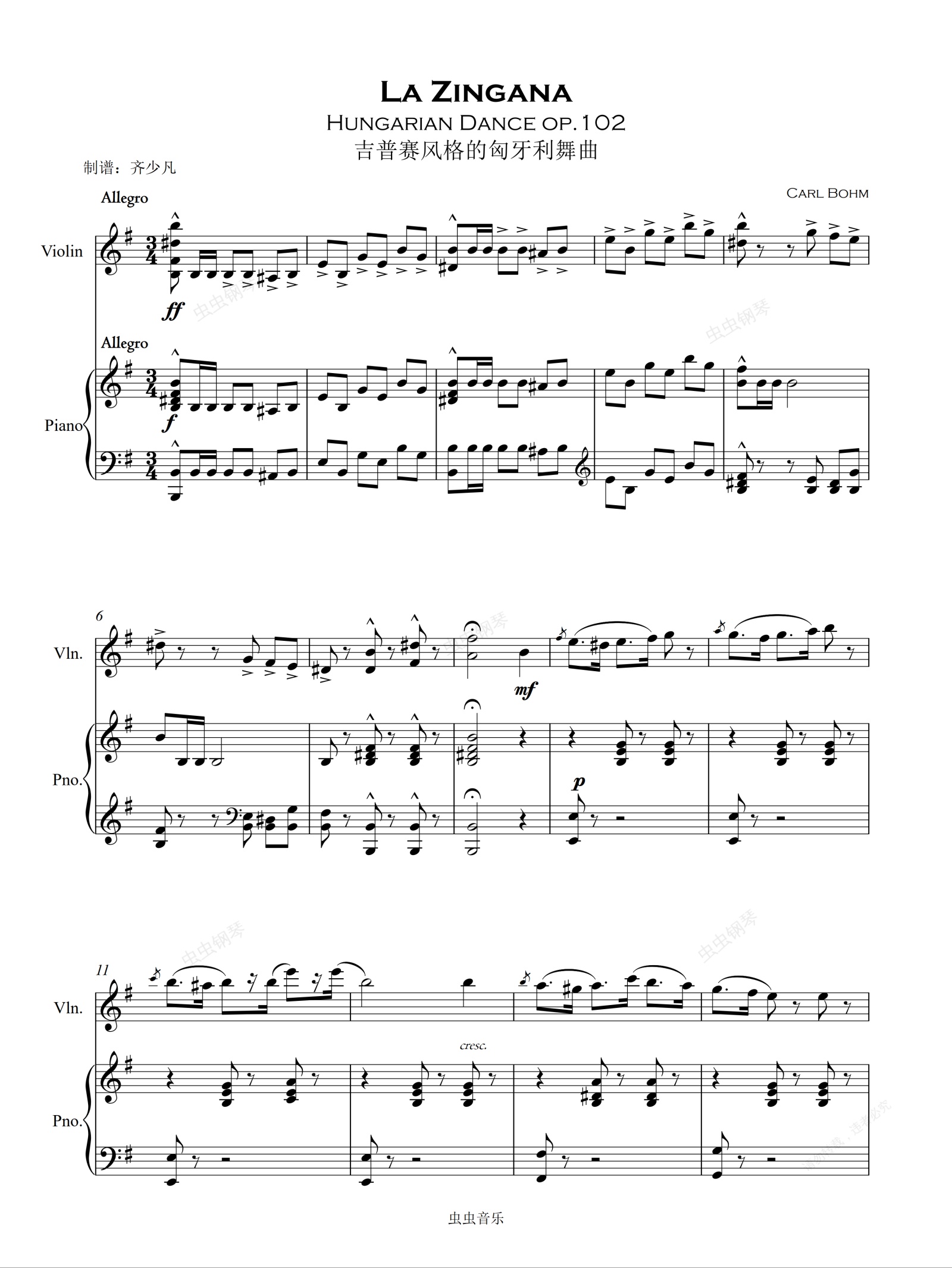 钢琴谱:【小提琴+钢琴】吉普赛风格的匈牙利舞曲 卡尔·伯姆