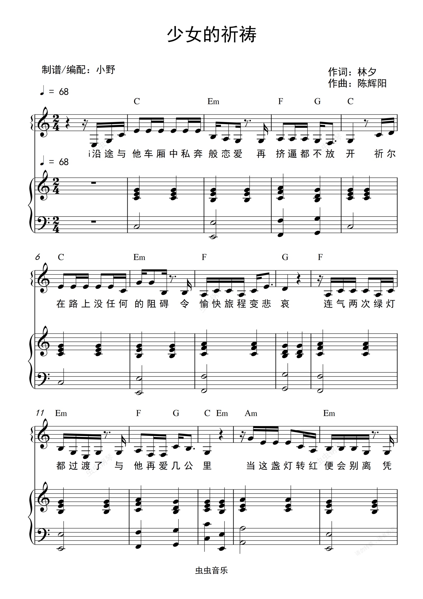 钢琴谱:少女的祈祷(C大调和弦弹唱版)