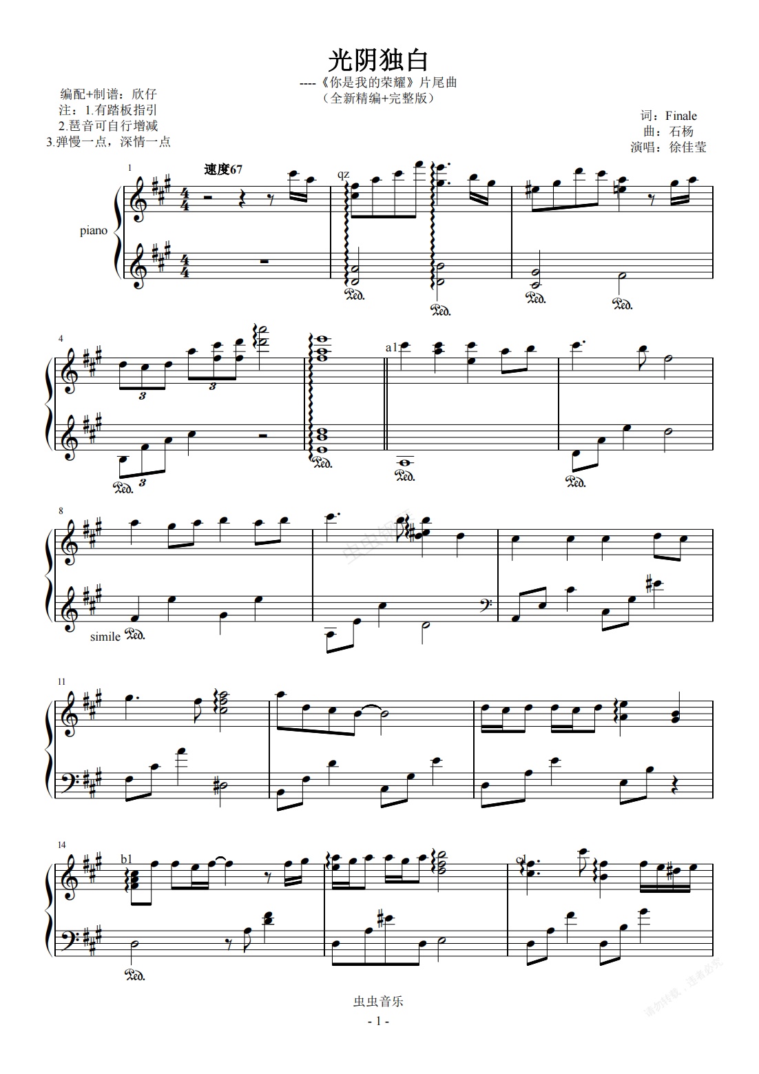 钢琴谱:徐佳莹《光阴独白》(《你是我的荣耀》片尾曲、全新精编+完整版)