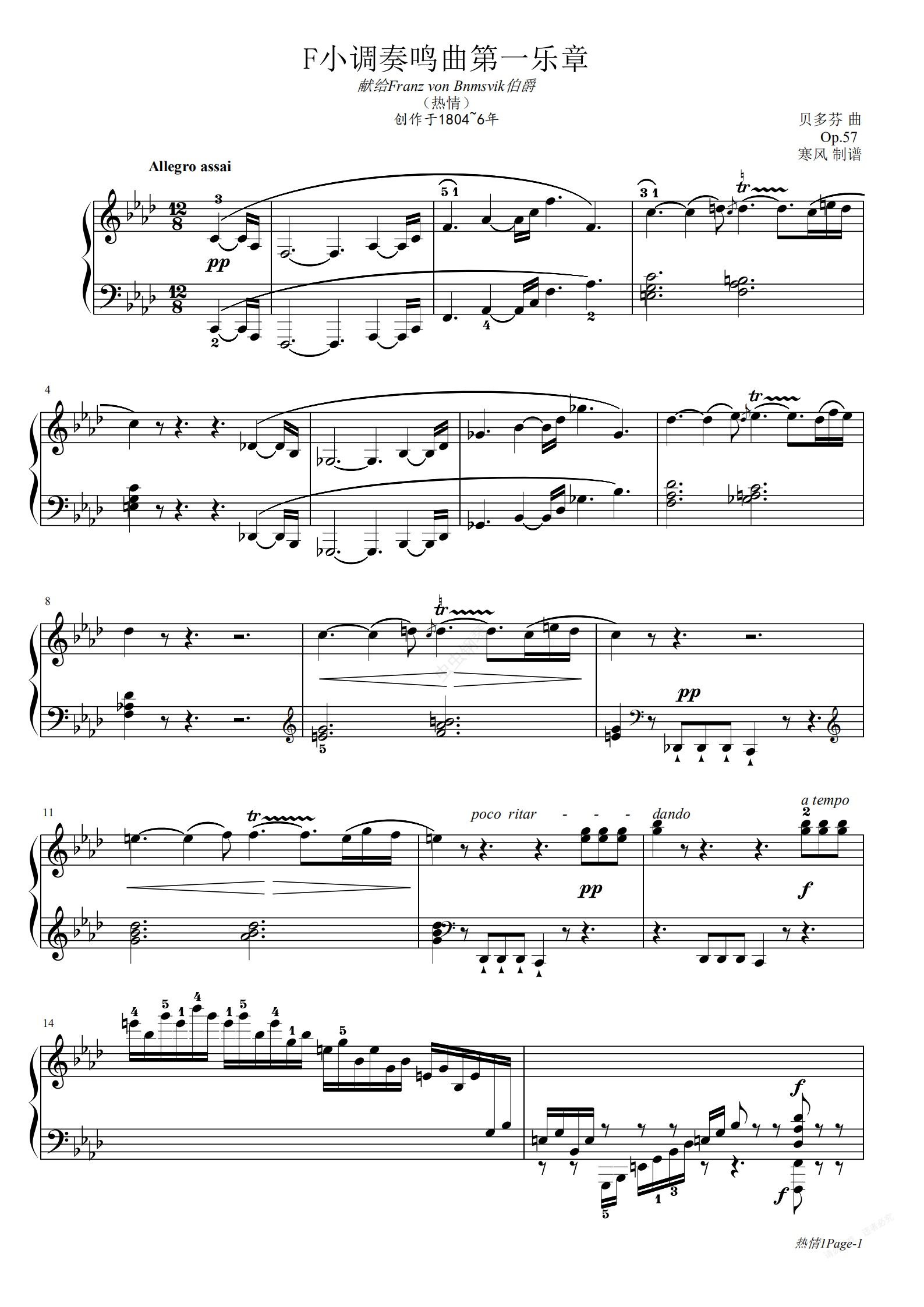 钢琴谱:贝多芬-热情奏鸣曲第一乐章