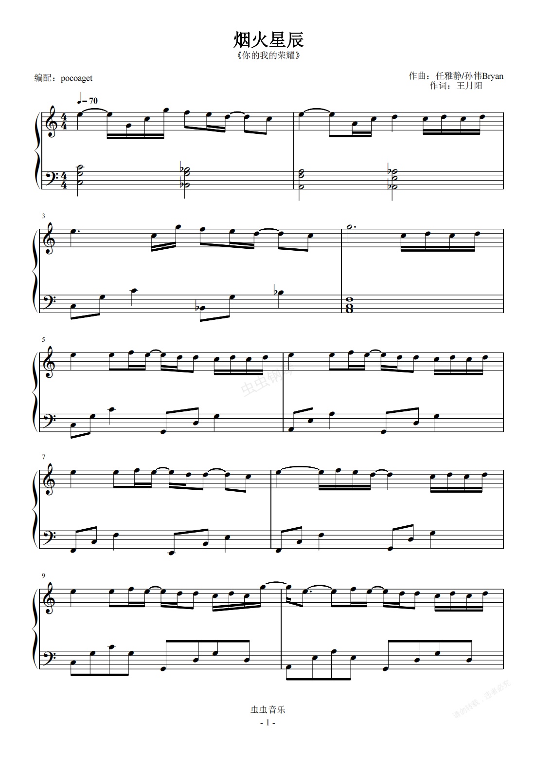 钢琴谱:烟火星辰《你是我的荣耀》poc编配)C调初学者