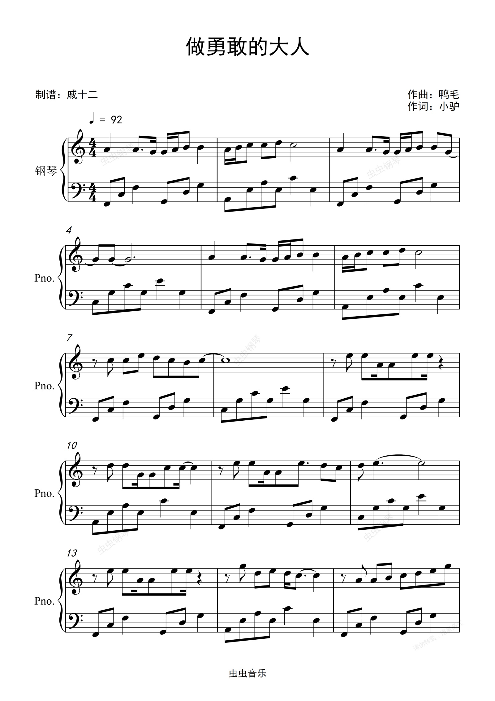 钢琴谱:做勇敢的大人-C调简单版
