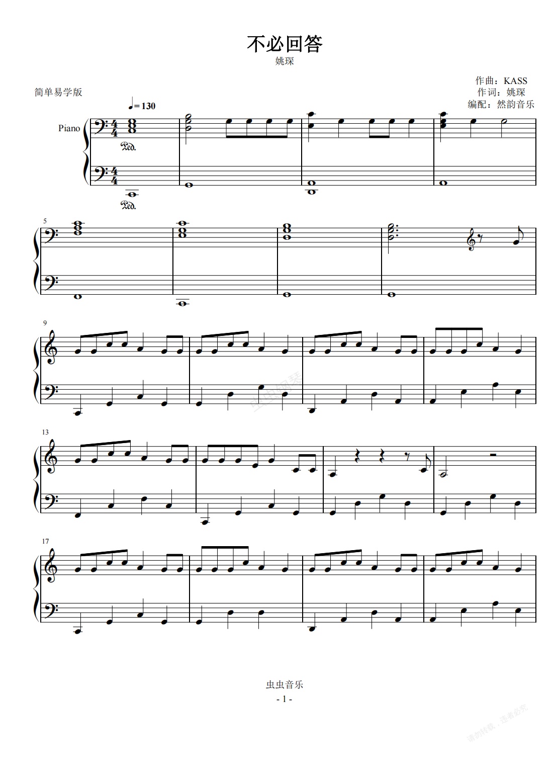 钢琴谱:【C调】不必回答-姚琛 简单易学版