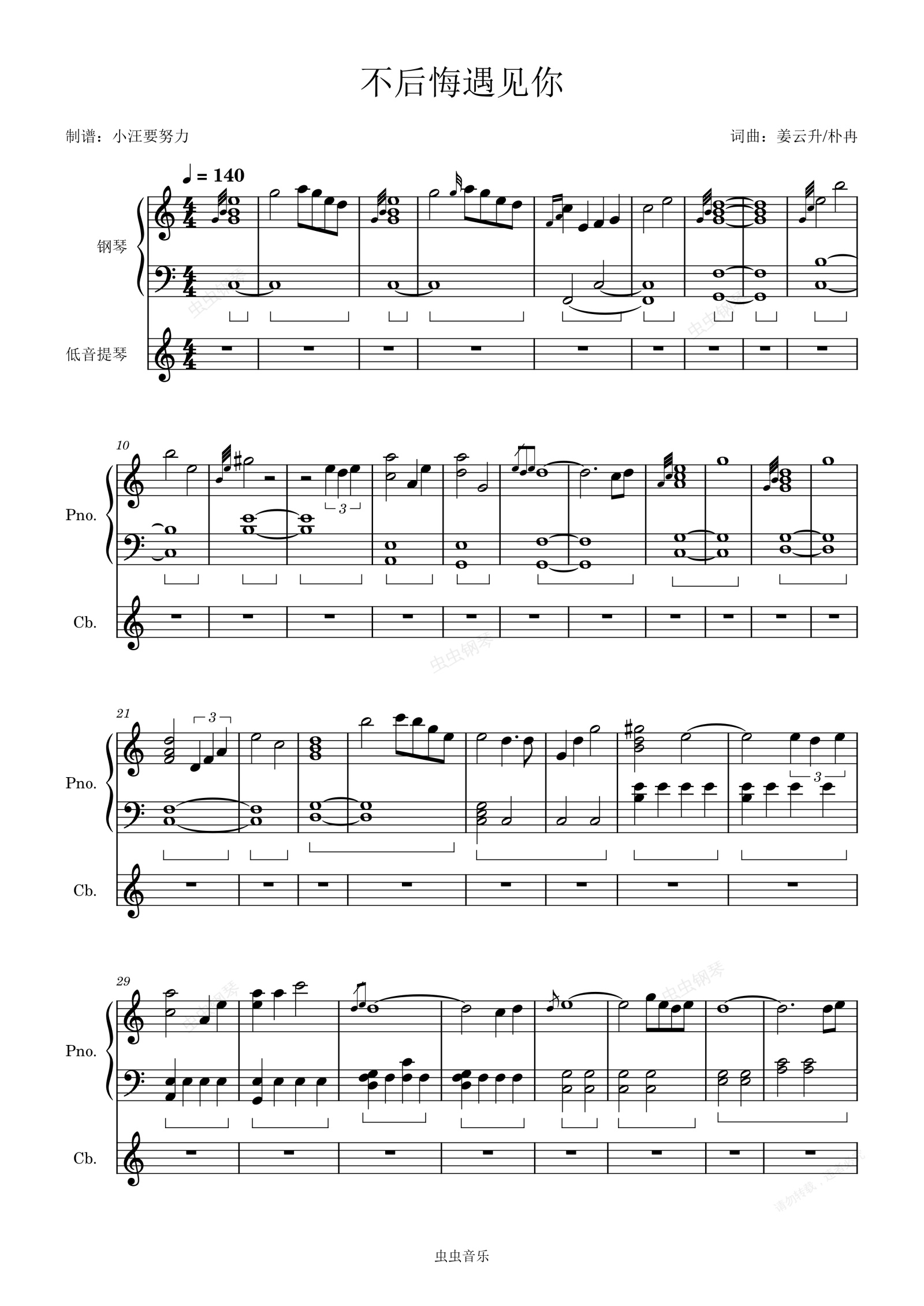 钢琴谱:不后悔遇见你-姜云升C调钢琴谱