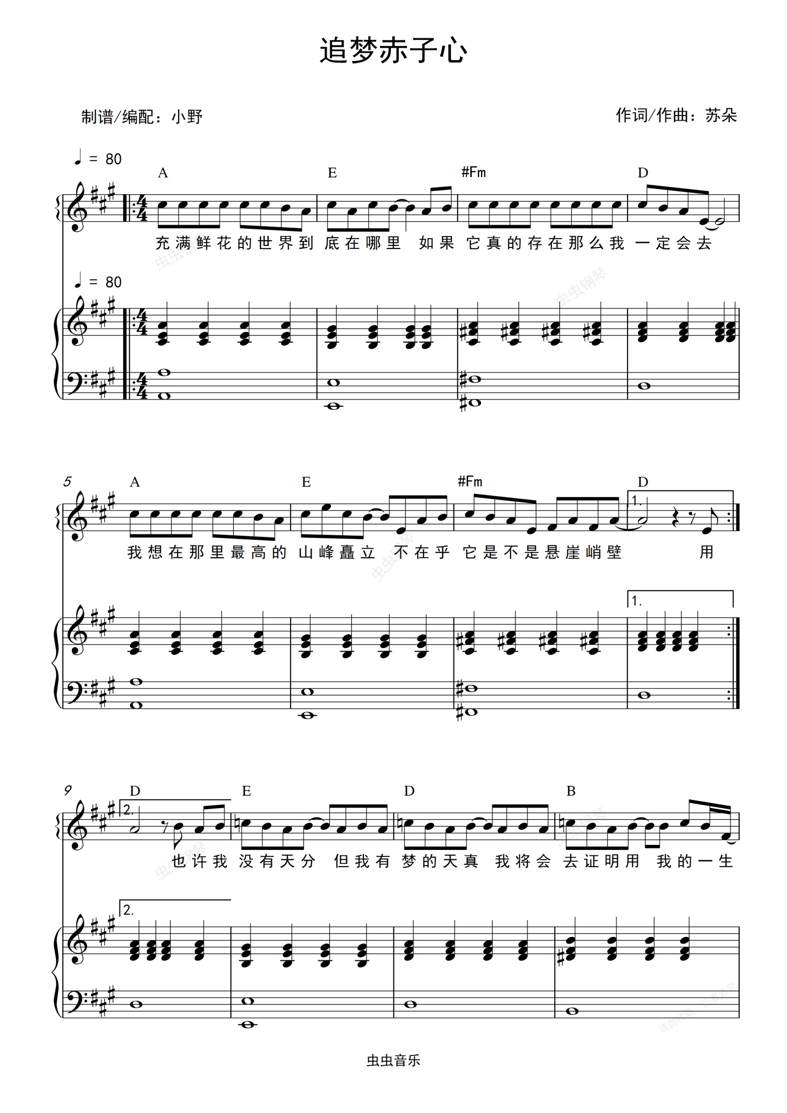 钢琴谱:追梦赤子心(和弦弹唱版)