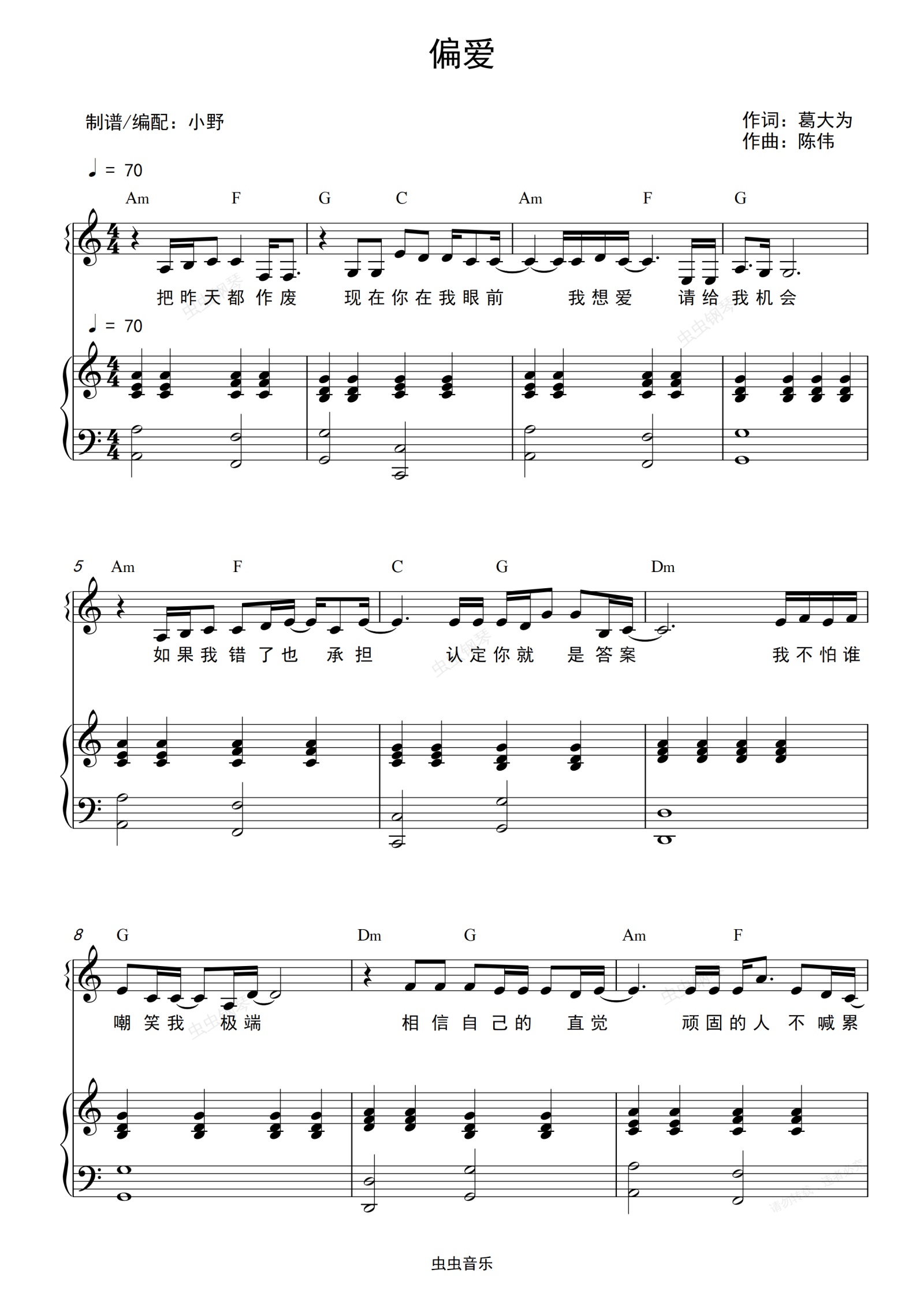 钢琴谱:偏爱(C调和弦弹唱版)