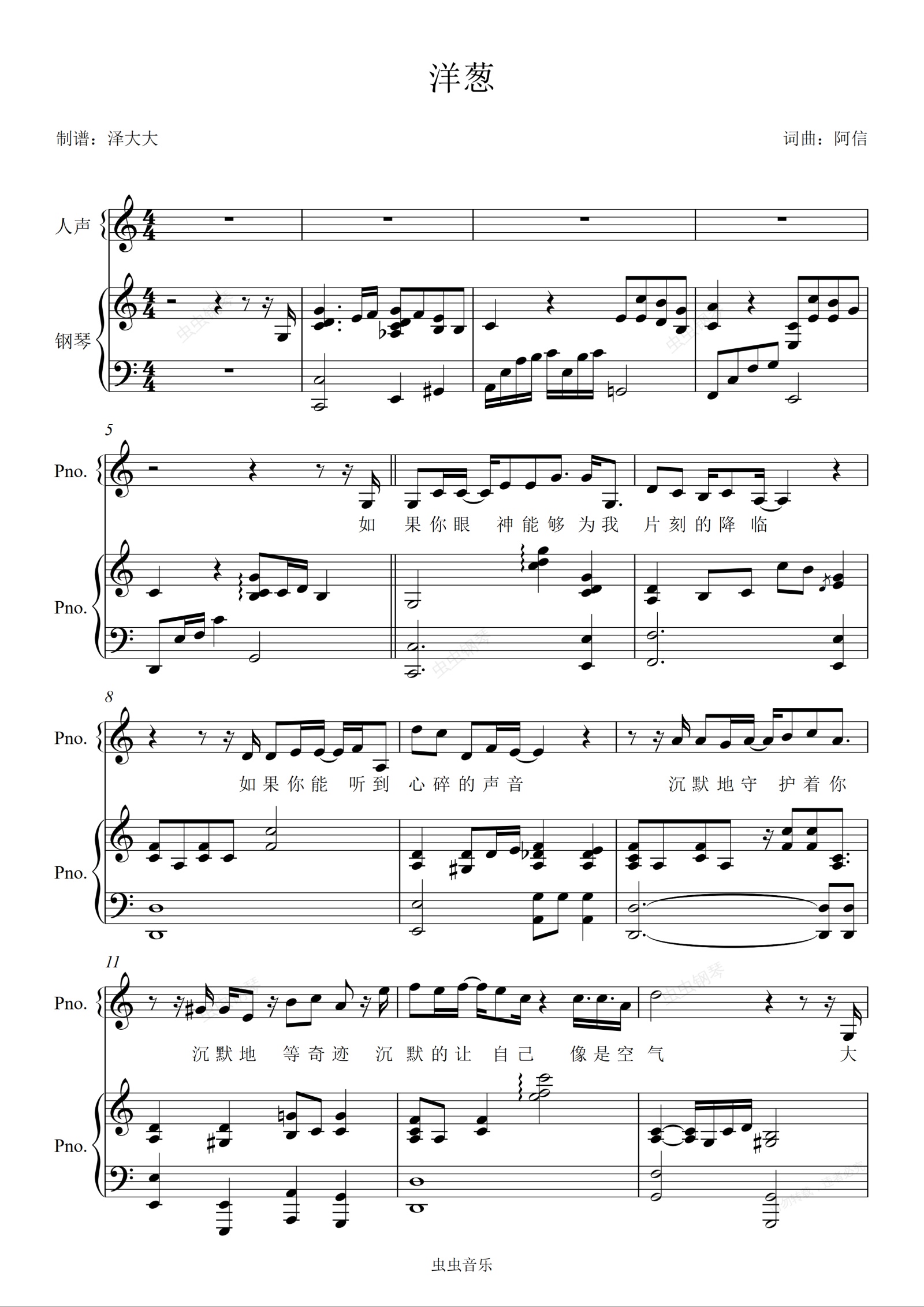 钢琴谱:洋葱【原版C调弹唱附词】泽大大 杨宗纬