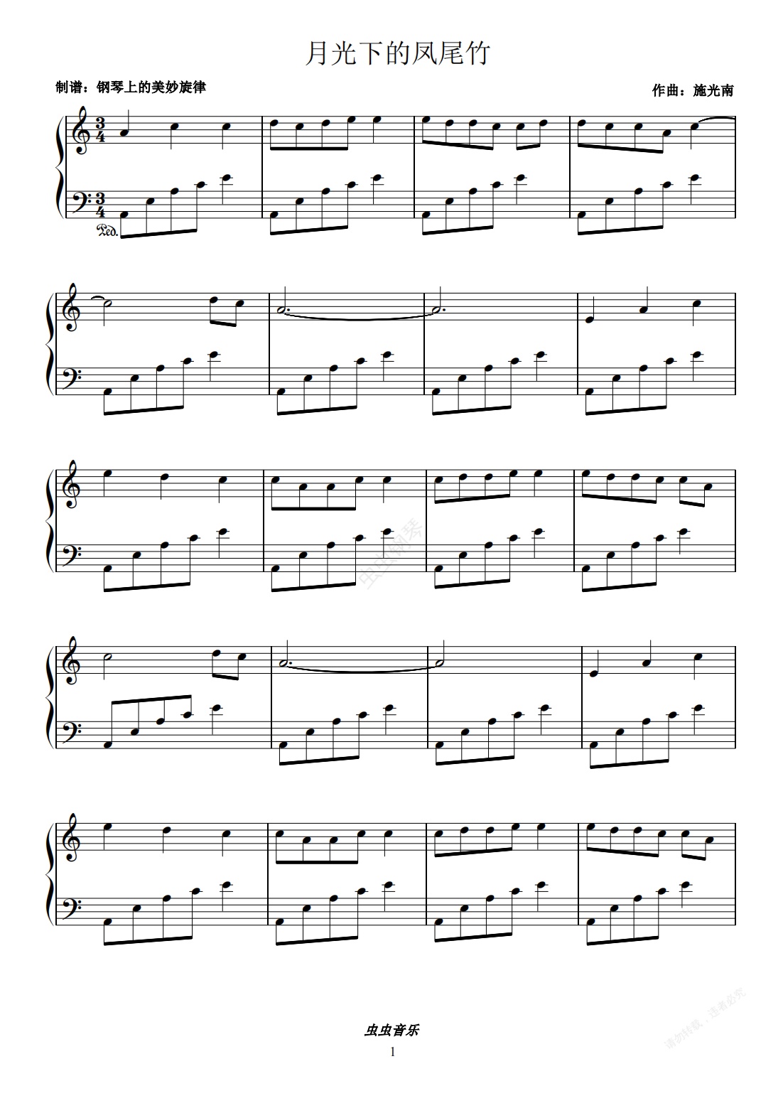 钢琴谱:月光下的凤尾竹 C调简易版 流行经典