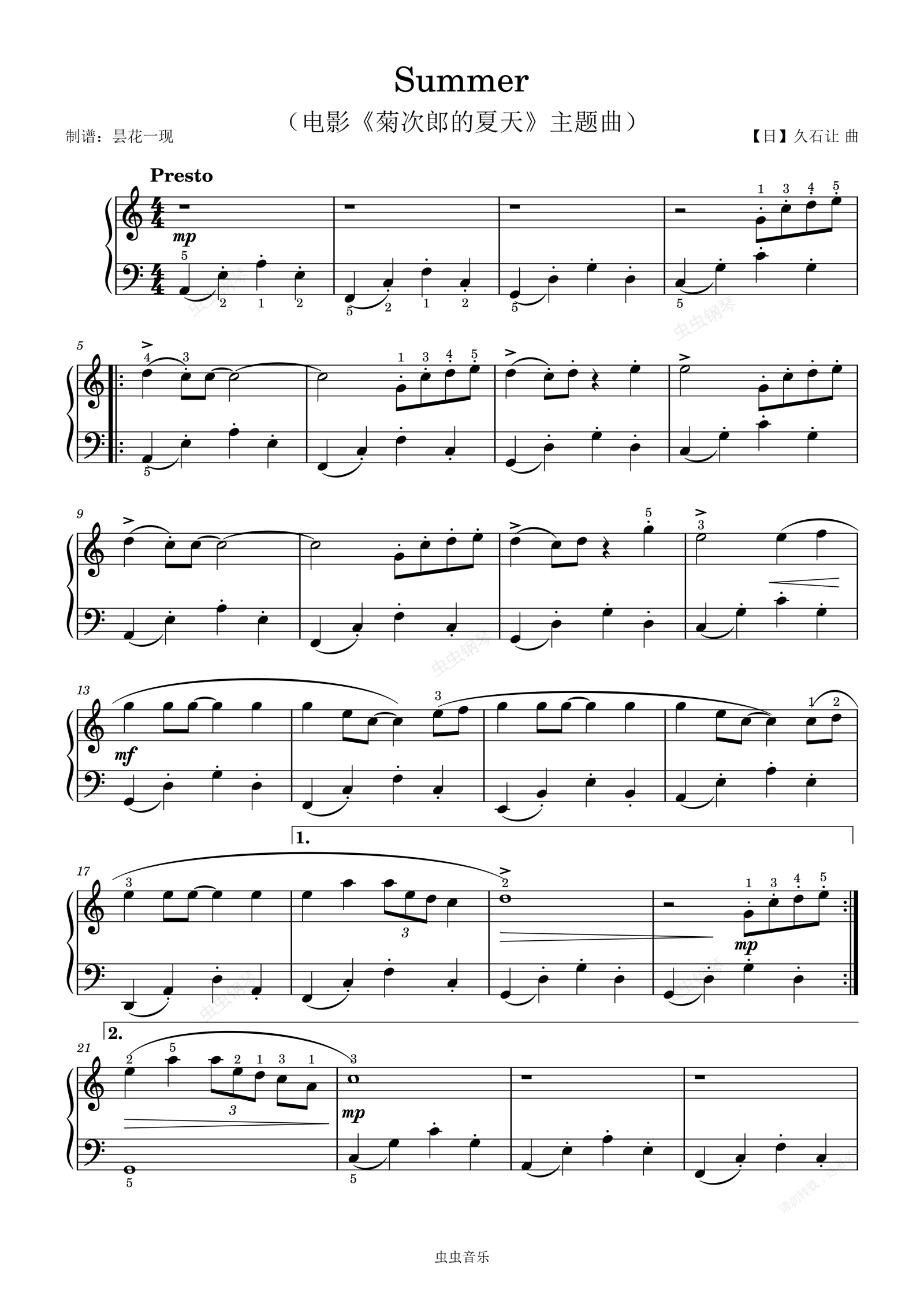 钢琴谱:Summer 菊次郎,2级程度,C大调简单版 - 久石让