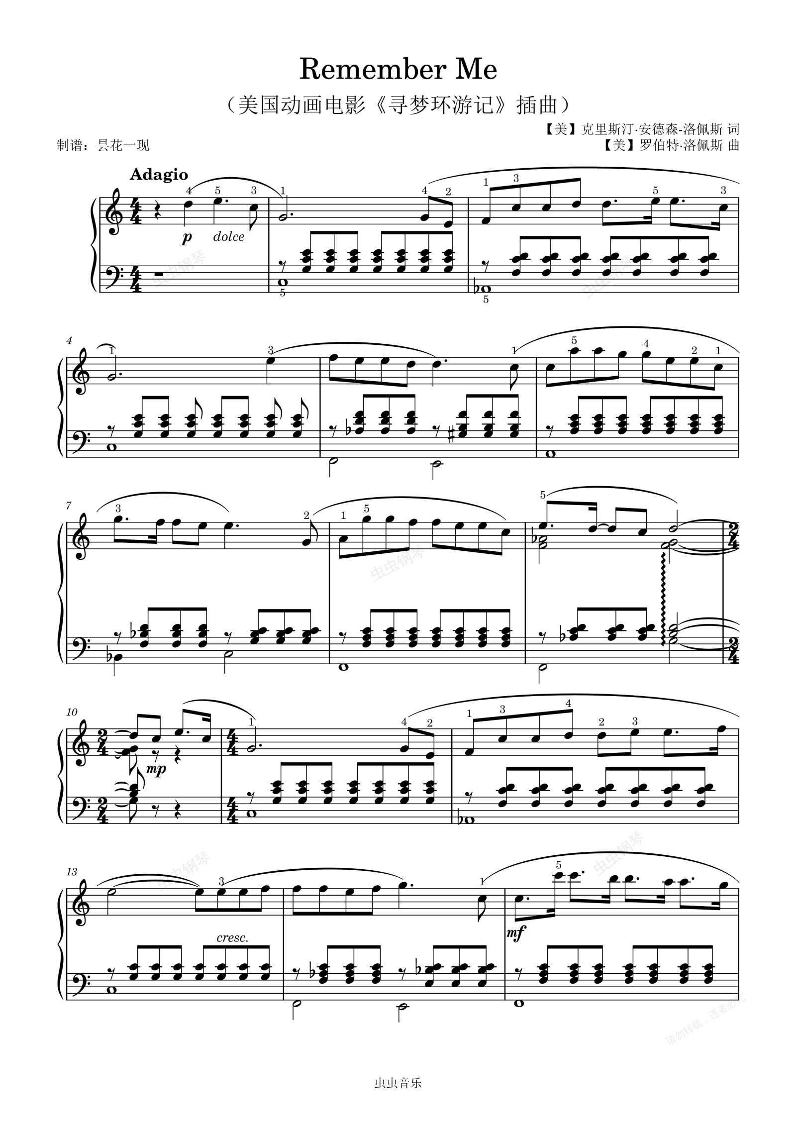 钢琴谱:Remember Me,C调简单版,(《寻梦环游记》插曲)