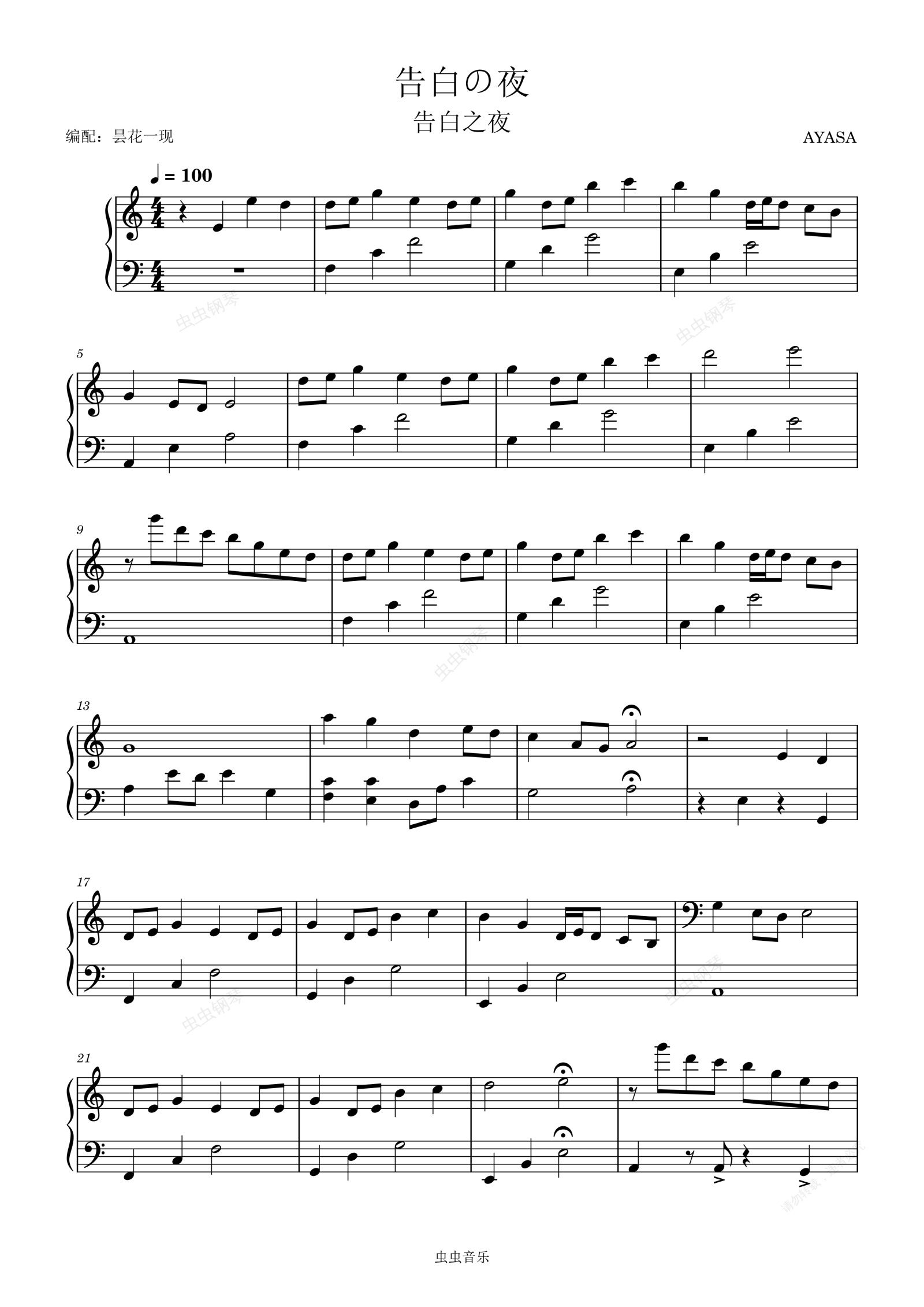 钢琴谱:告白の夜(告白之夜)C大调简单版,AYASA