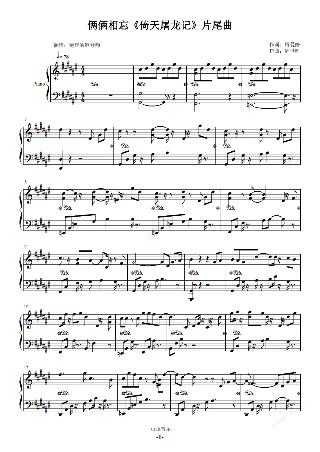 钢琴谱:俩俩相忘 《倚天屠龙记》结尾曲