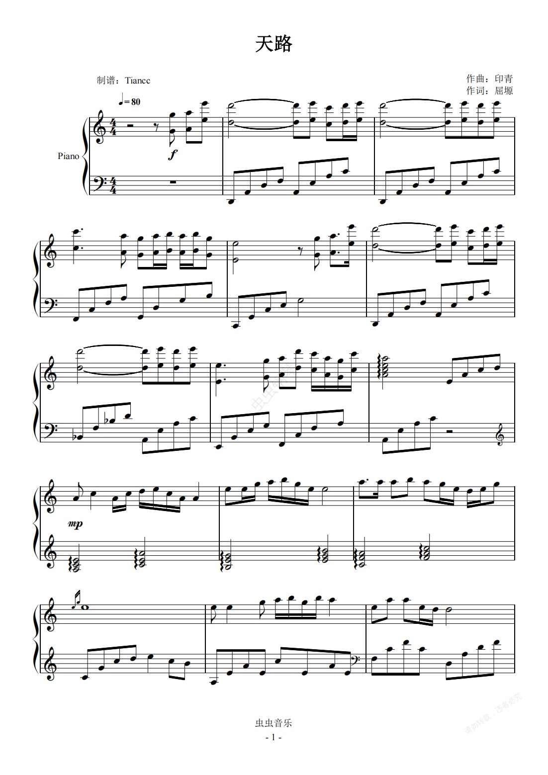 钢琴谱:《天路》教学专用版,右手八度初级练习,599难度