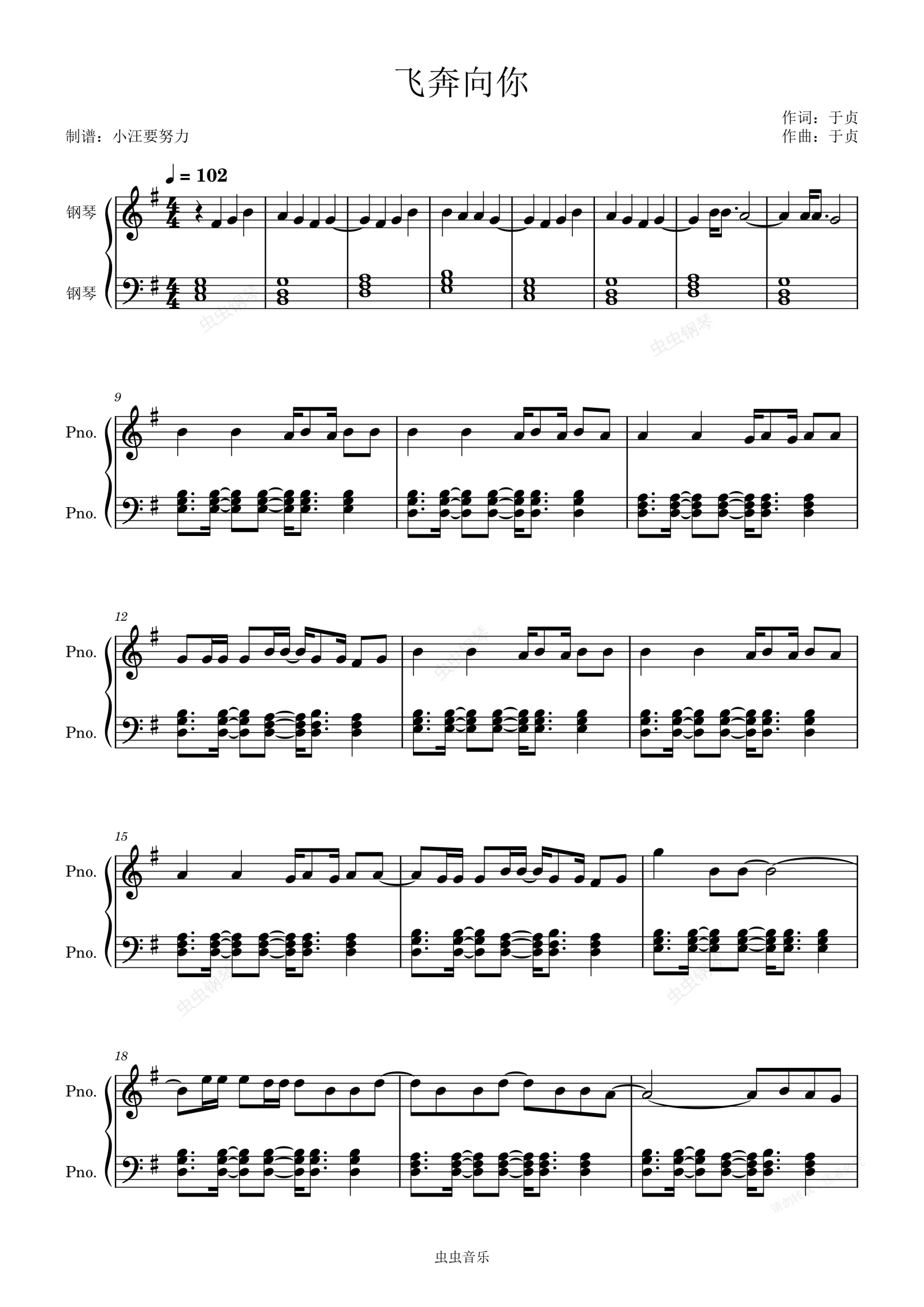 钢琴谱:飞奔向你-于贞G调原版钢琴谱