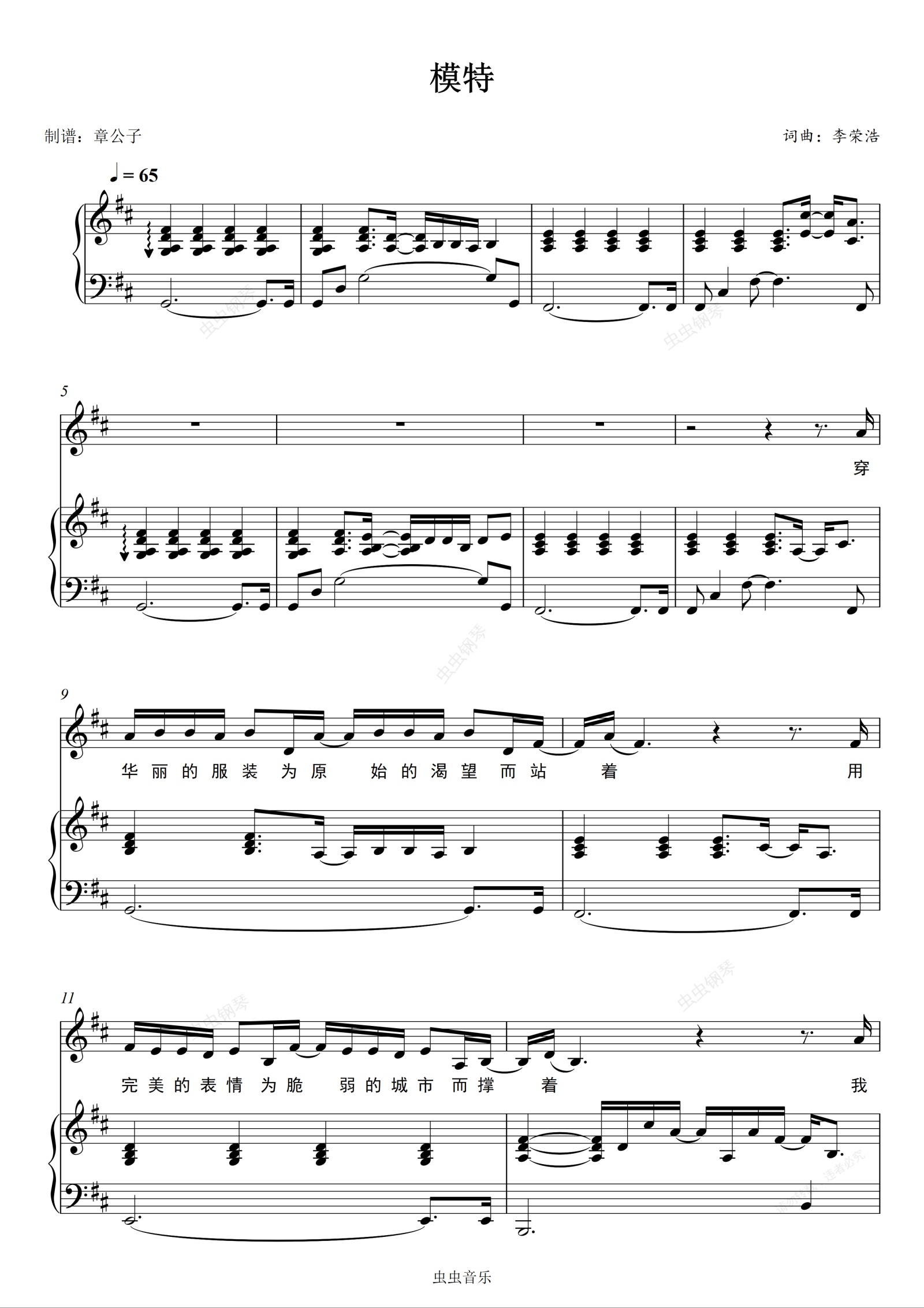 钢琴谱:《模特》(李荣浩) 弹唱(伴奏)谱